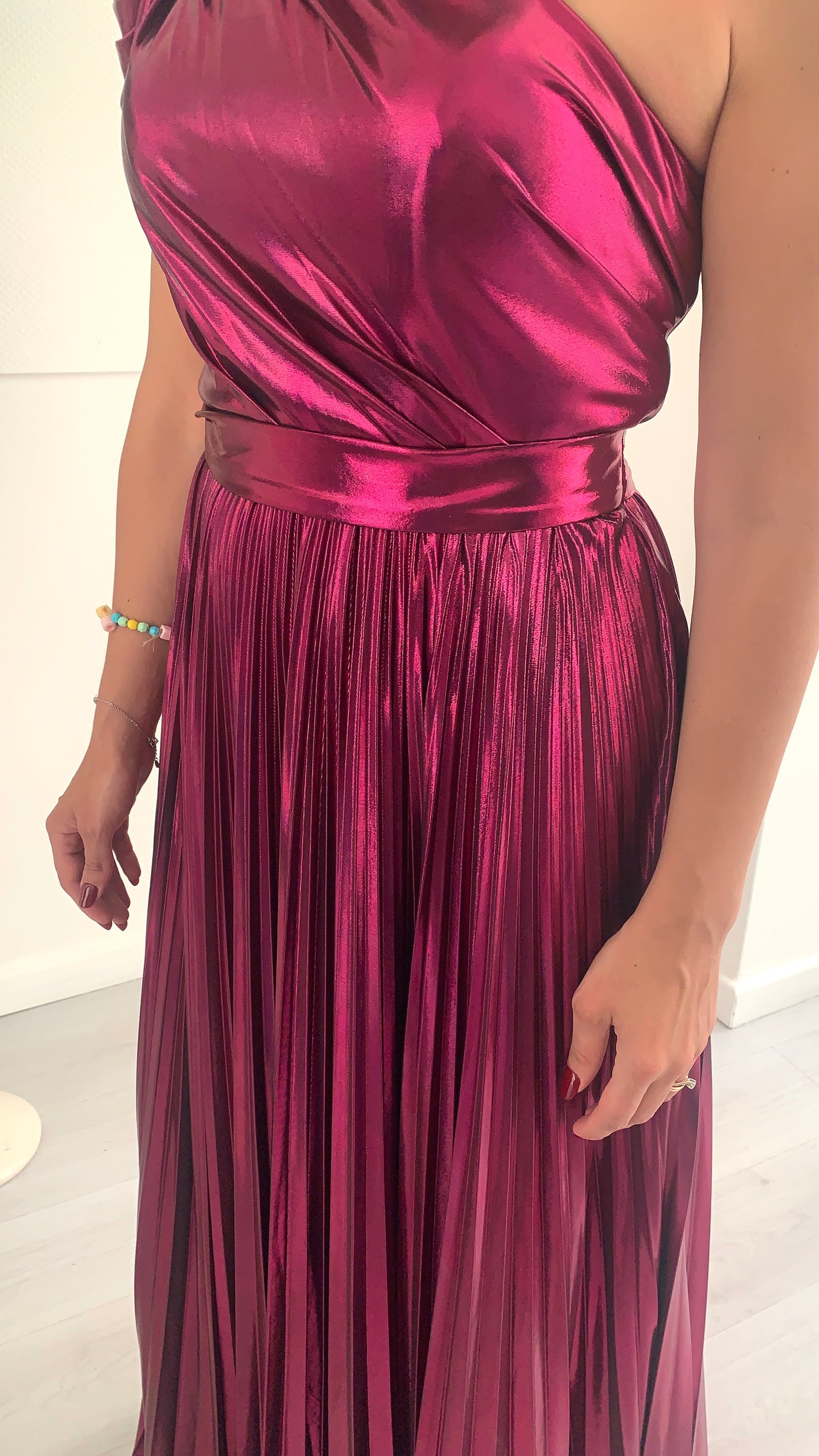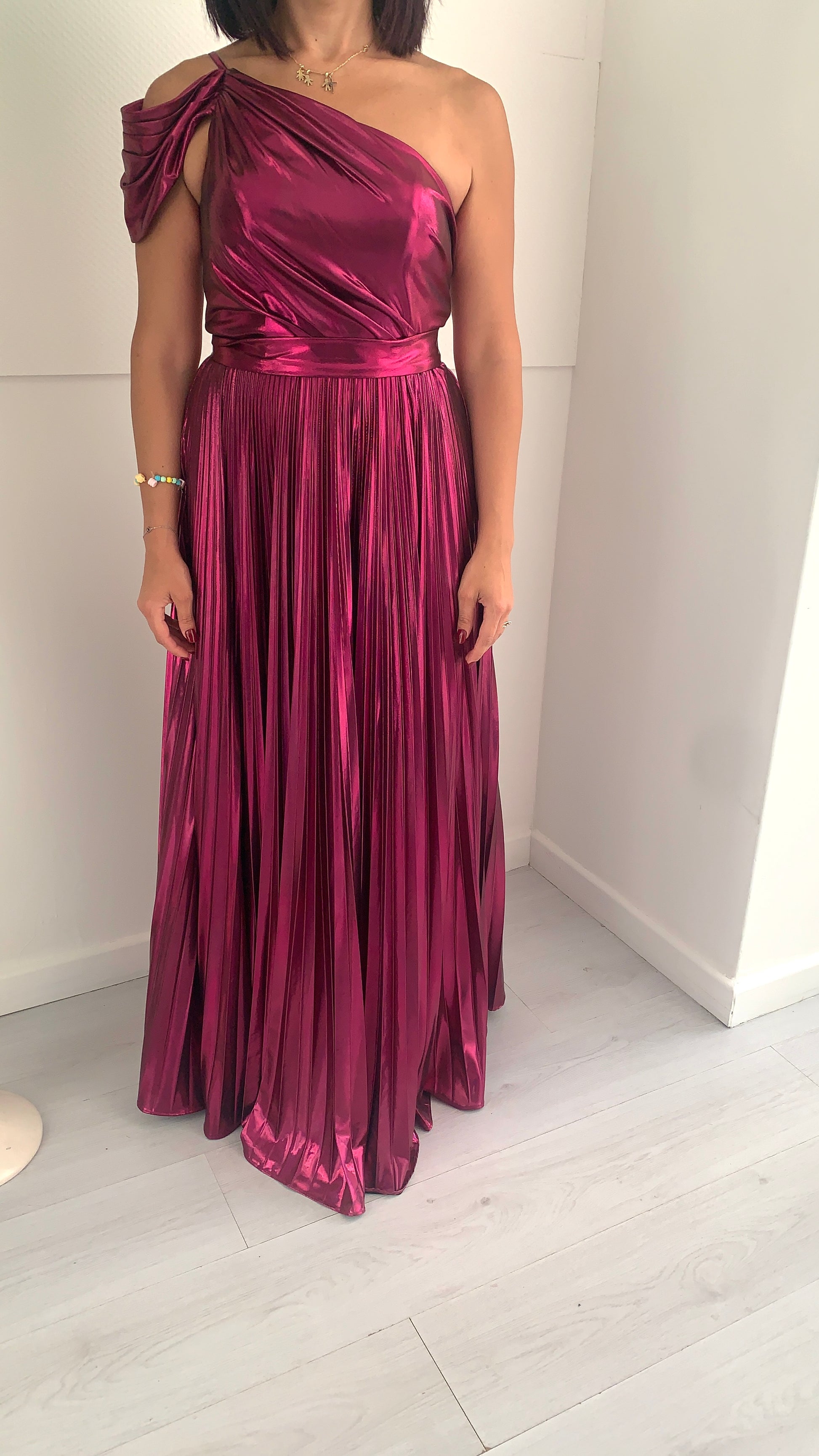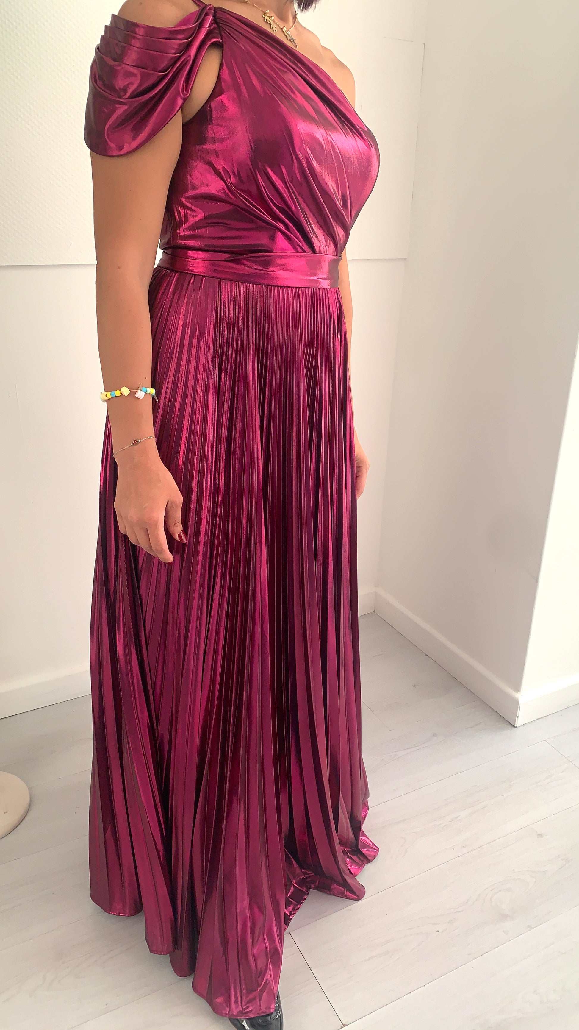 Questo abito monospalla plissettato in tessuto metalizzato color magenta unisce eleganza e originalità. La texture plissé valorizza ogni movimento, mentre la tonalità vibrante dona un tocco sofisticato e moderno, ideale per occasioni speciali e serate esclusive.
