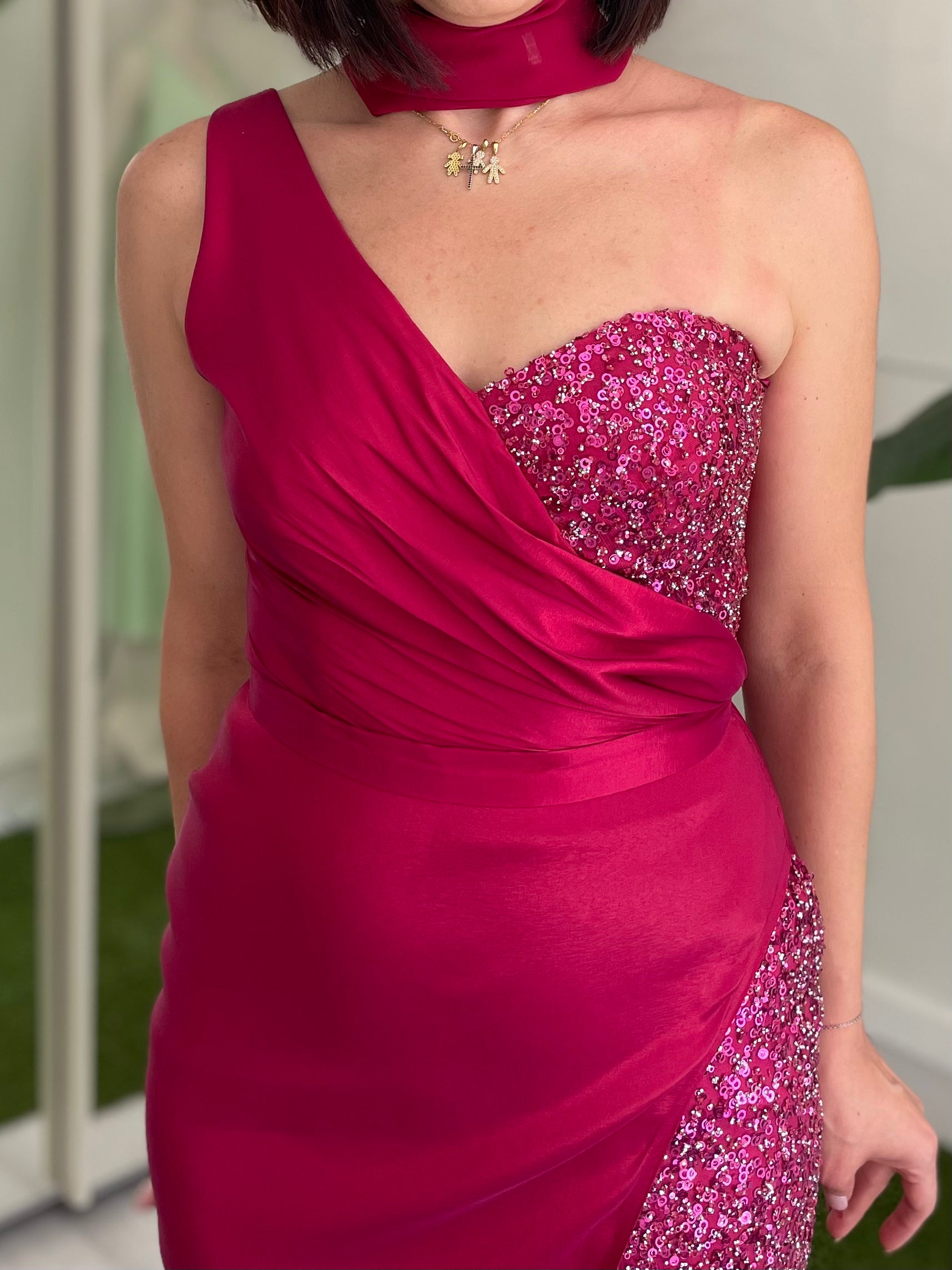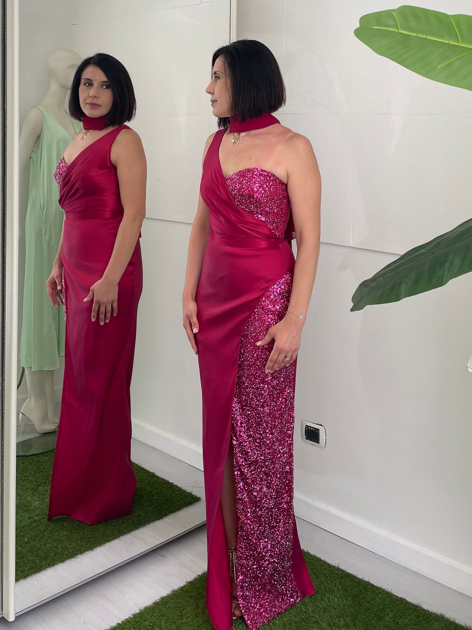 Elegante abito lungo monospalla in taftà elasticizzato, con scollo a cuore che valorizza la silhouette. Riccamente decorato con applicazioni raffinate, offre un tocco di lusso e femminilità. Completo di stola coordinata, ideale per occasioni speciali in cui distinguersi con stile e raffinatezza.