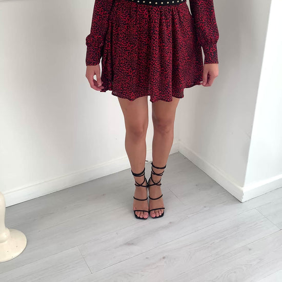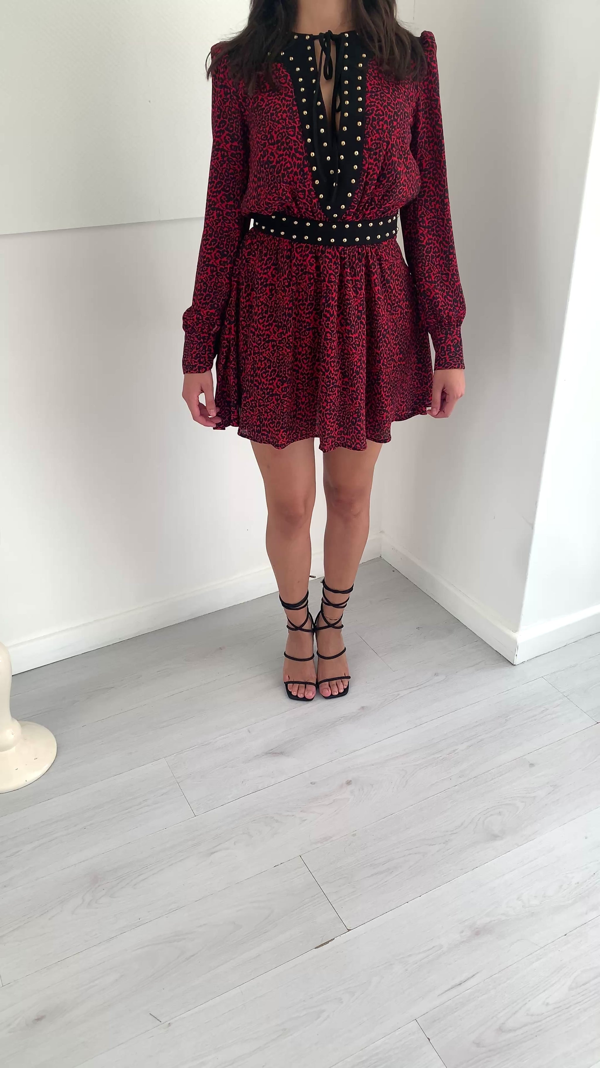 Abito corto in georgette dall’elegante stampa animalier rossa e nera, arricchito da dettagli in borchiette che donano un tocco moderno e sofisticato. Perfetto per chi cerca un capo distintivo, leggero e di grande impatto visivo.