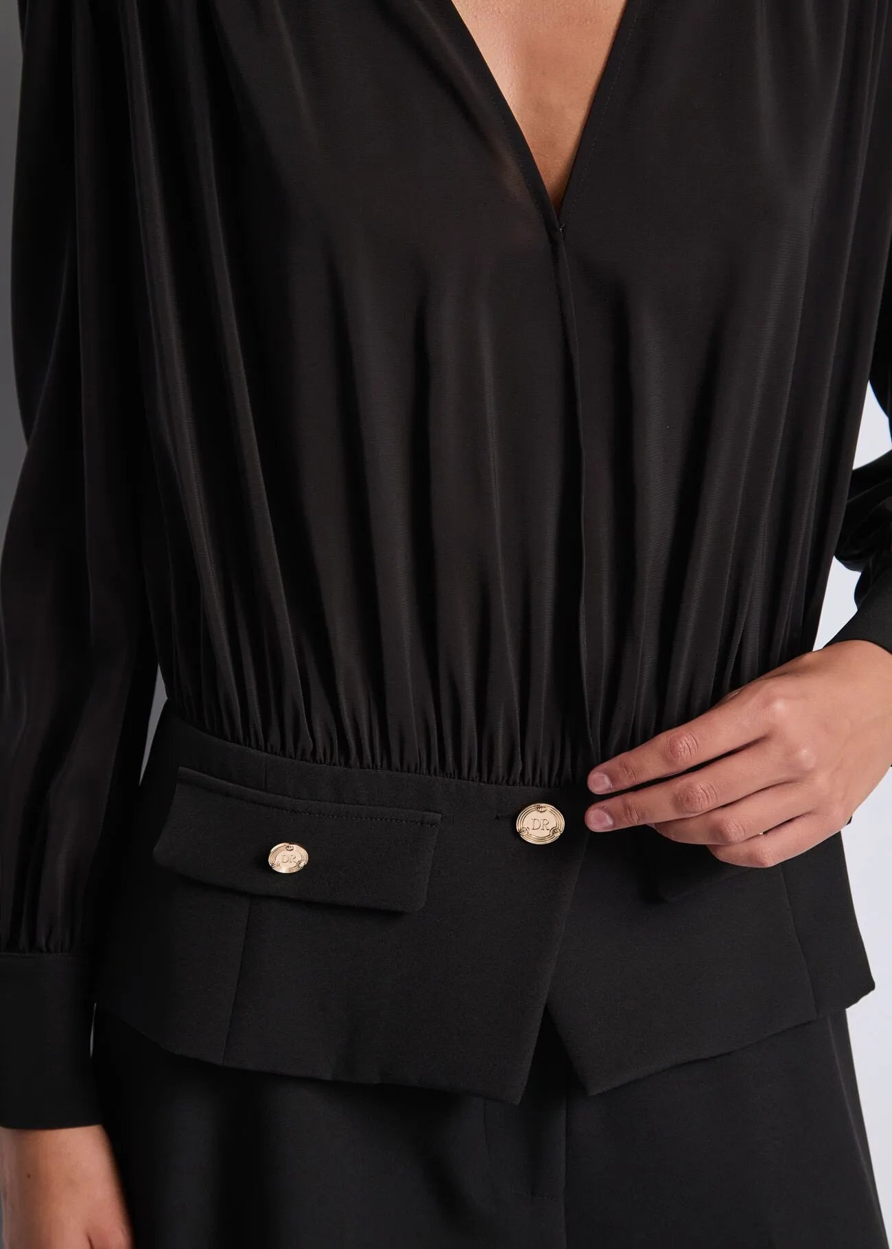 La giacca DENNY ROSE combina la leggerezza e la trasparenza del georgette con la solidità del tessuto, creando un capo raffinato e versatile. Il dettaglio del bottone singolo conferisce un tocco elegante e sobrio, ideale per completare look professionali o sofisticati.