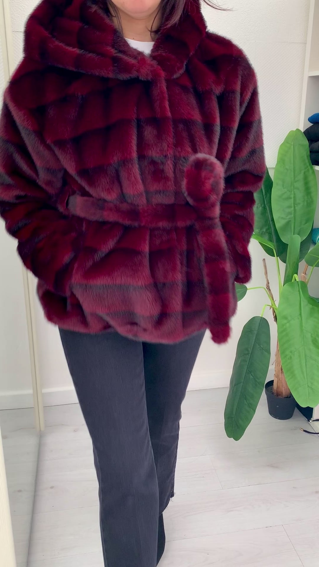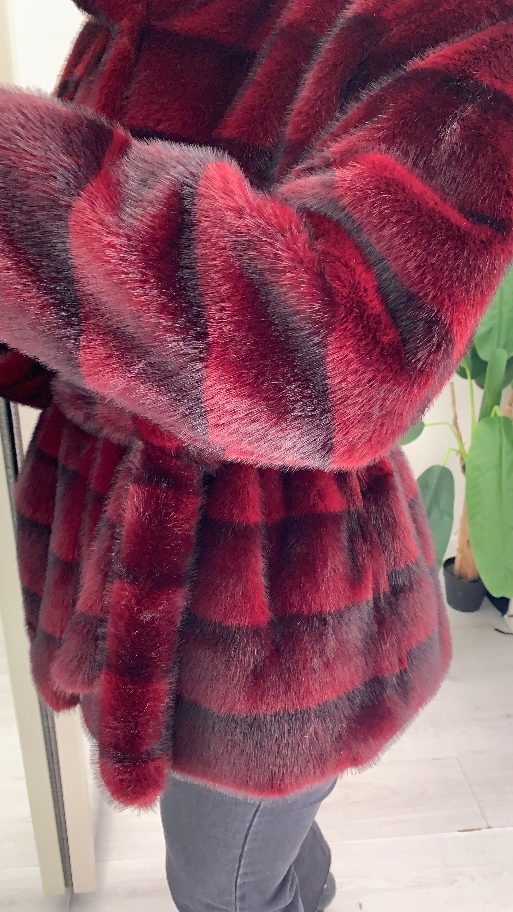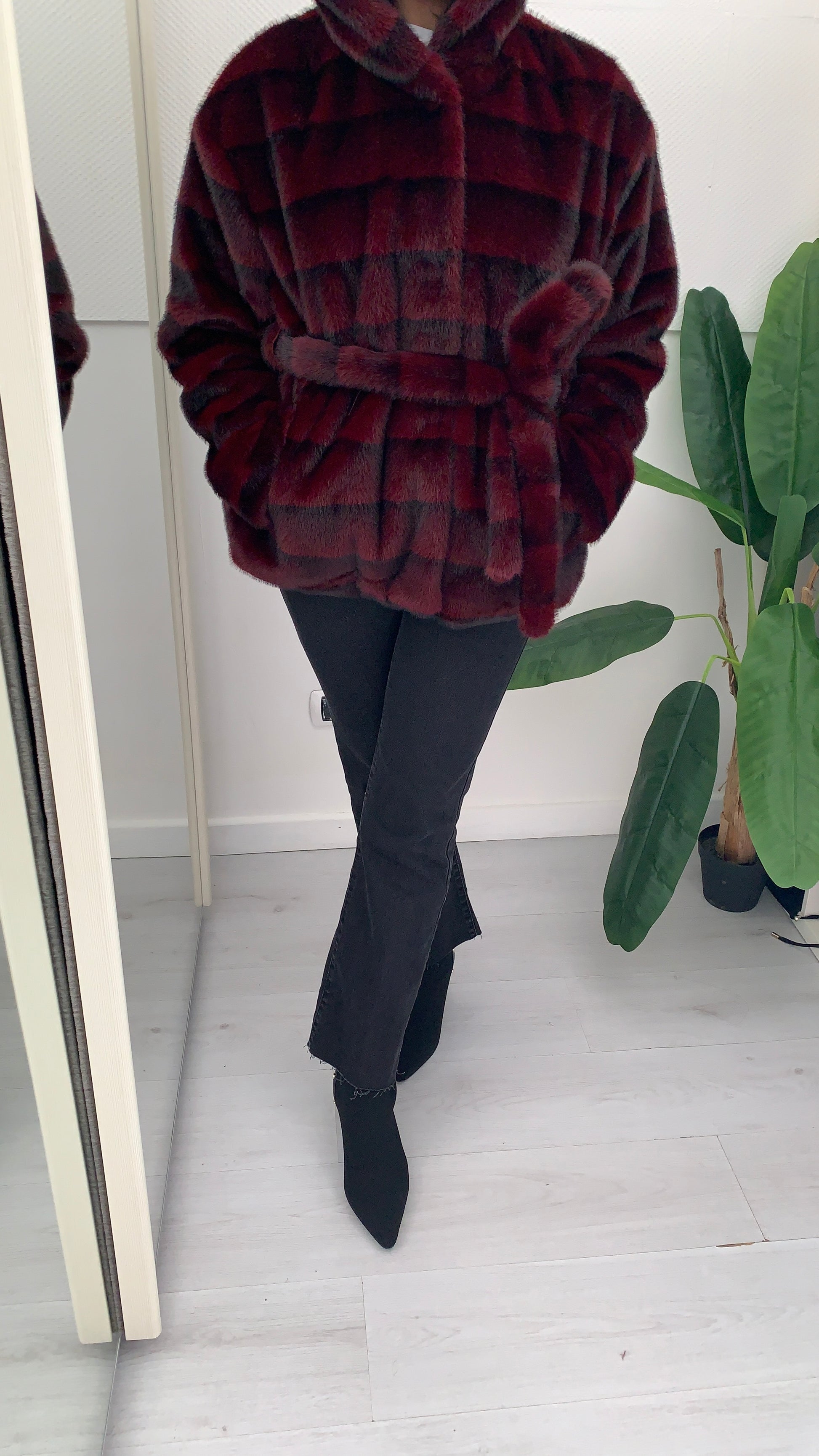 Sofisticata ecopelliccia con motivo zebrato bordeaux e nero. Il modello Eliseo presenta una cintura regolabile che valorizza la silhouette con eleganza. Realizzata con materiali eco-friendly, combina stile contemporaneo e consapevolezza ambientale in un capo versatile e raffinato.