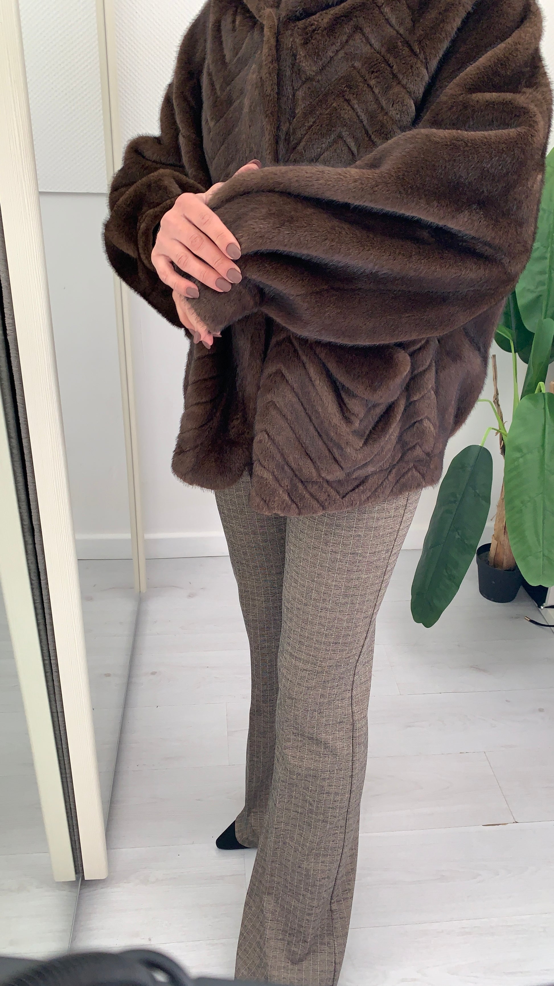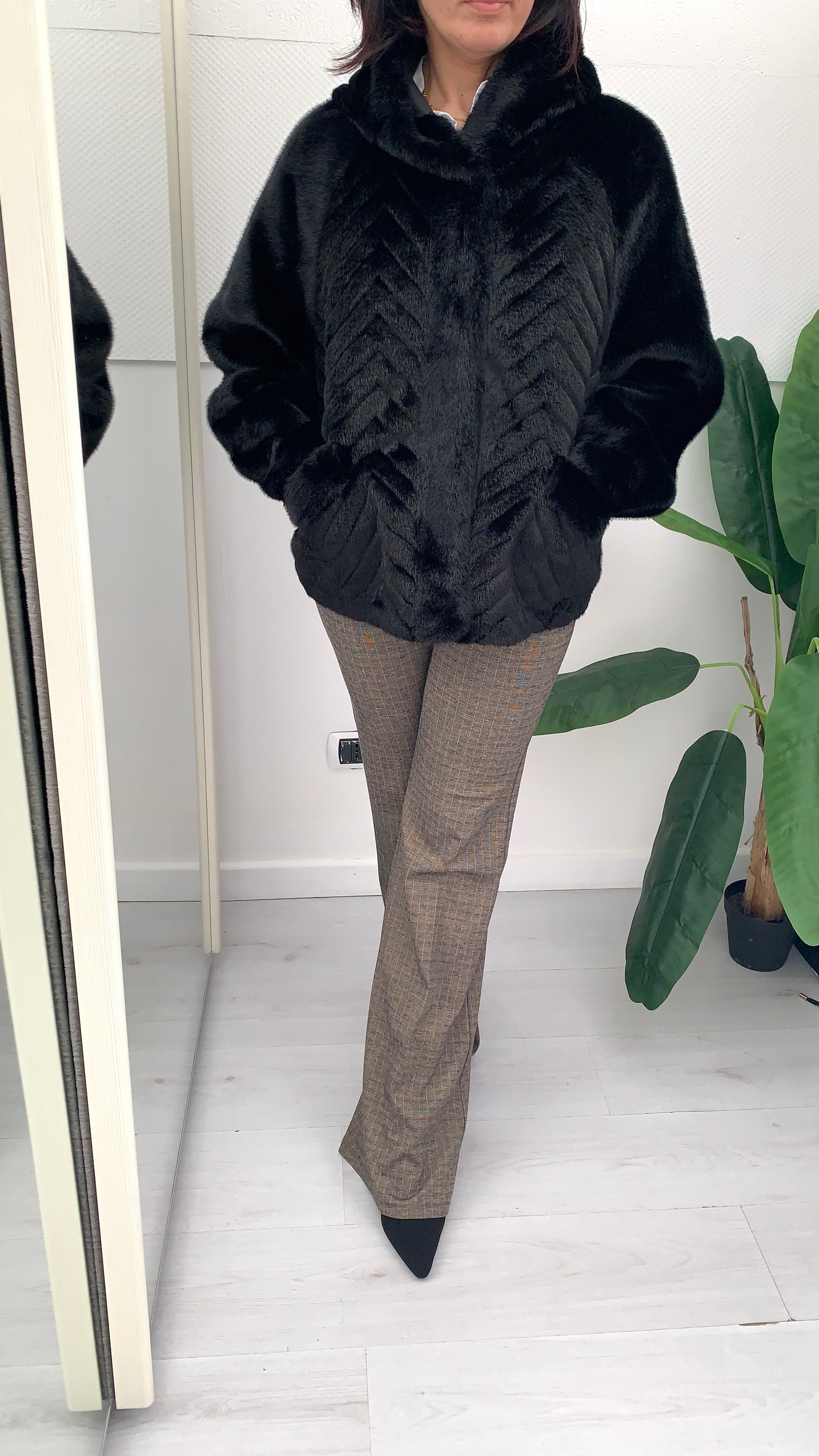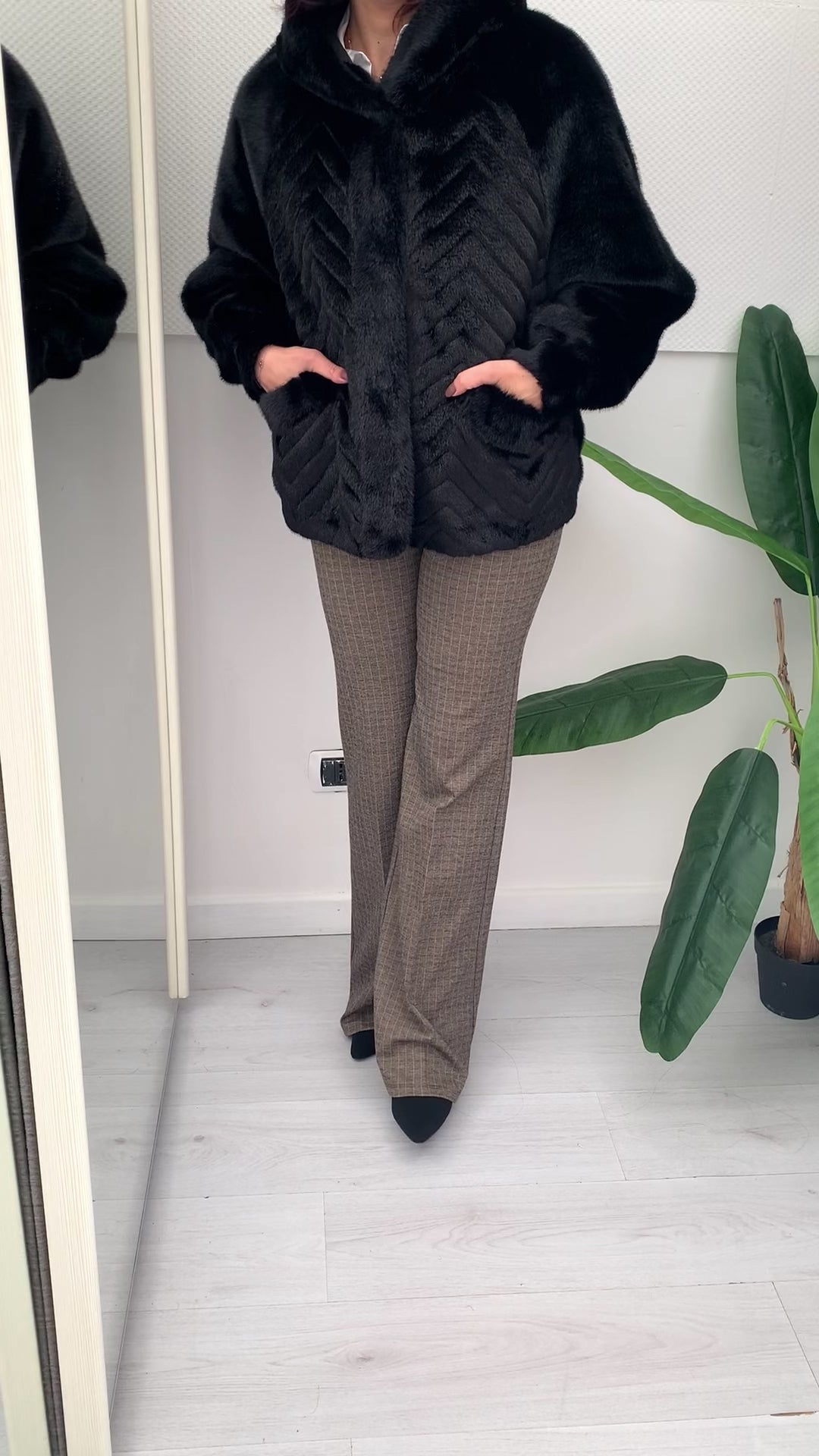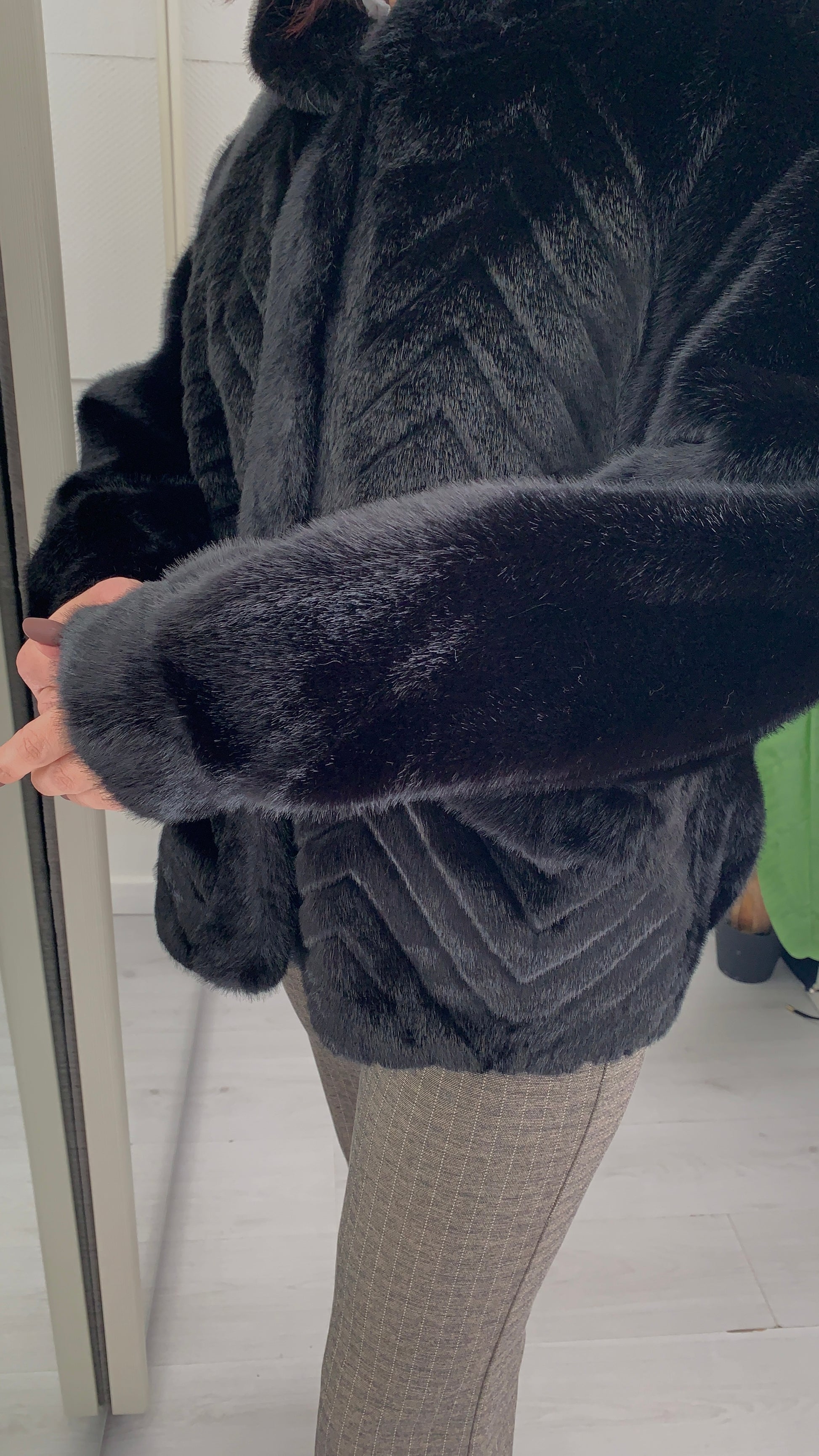 Un capo must-have per la stagione fredda: il bomber in ecopelliccia effetto Chevronne con lavorazione scannellata combina morbidezza e carattere in perfetto equilibrio