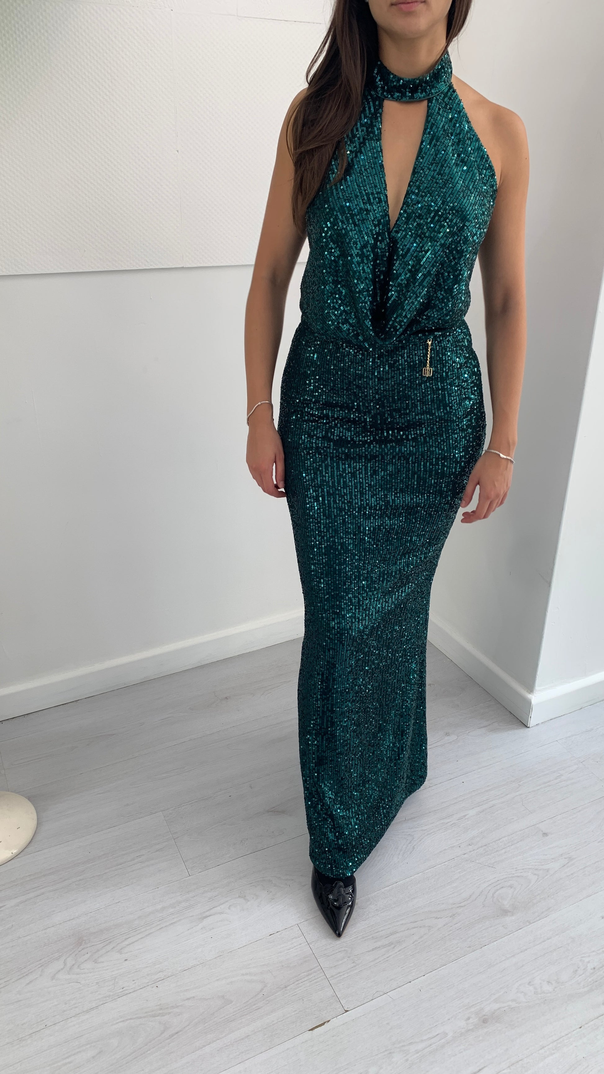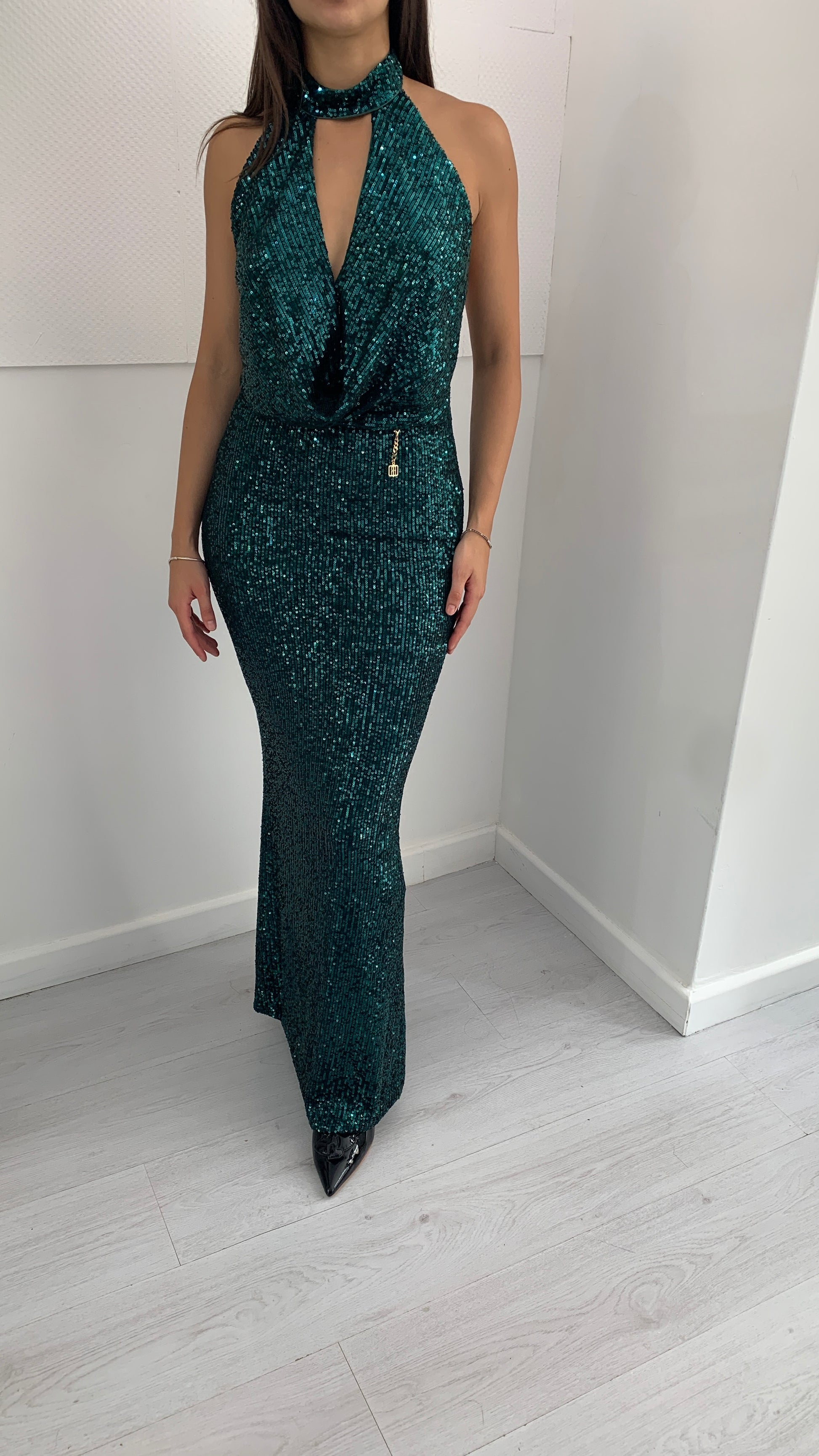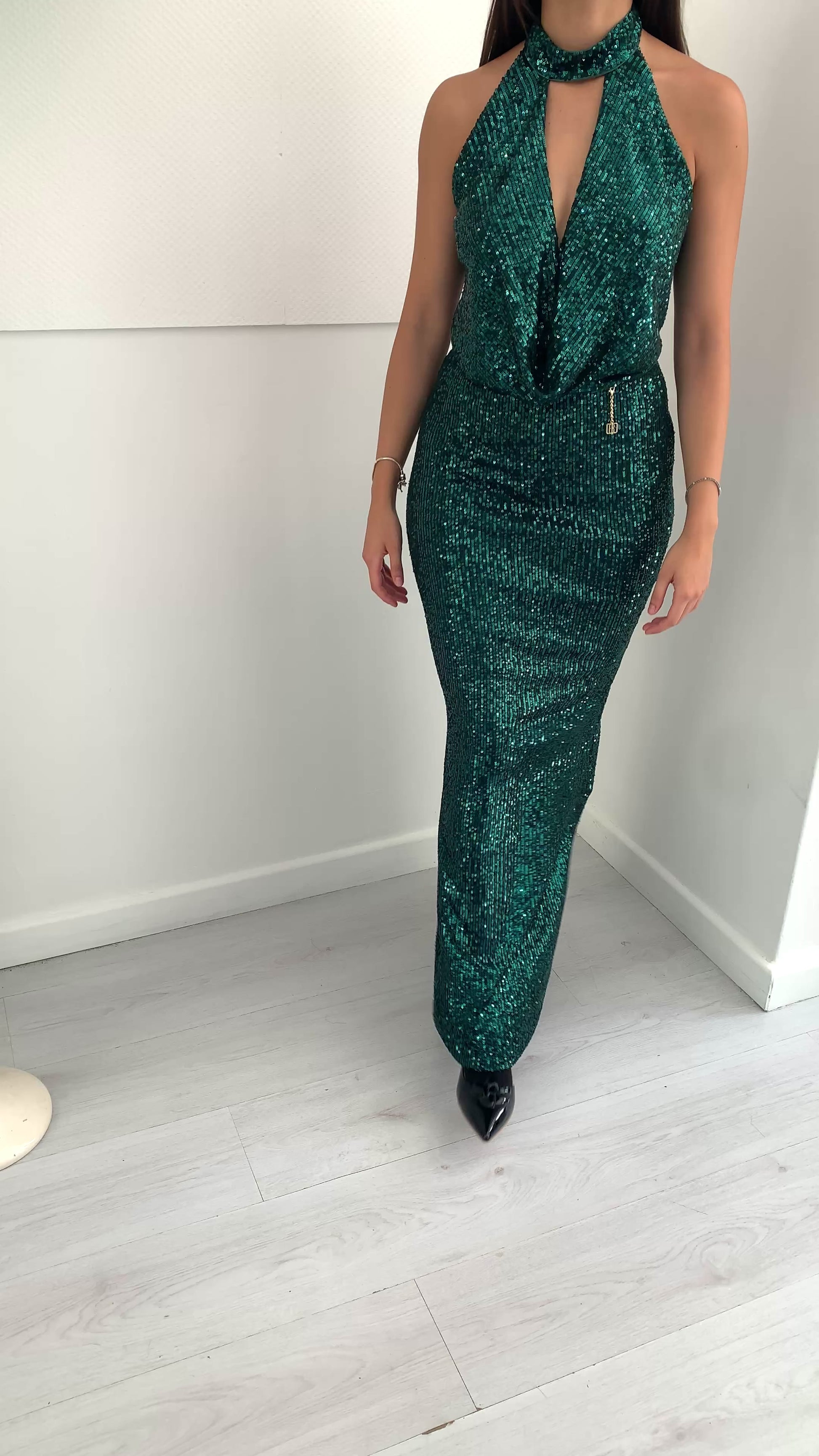 Abito lungo con scollo all’americana impreziosito da eleganti paillettes verde smeraldo, perfetto per serate di classe. Il design raffinato valorizza la silhouette mantenendo un tocco sofisticato e moderno. Ideale per eventi formali e occasioni speciali.
