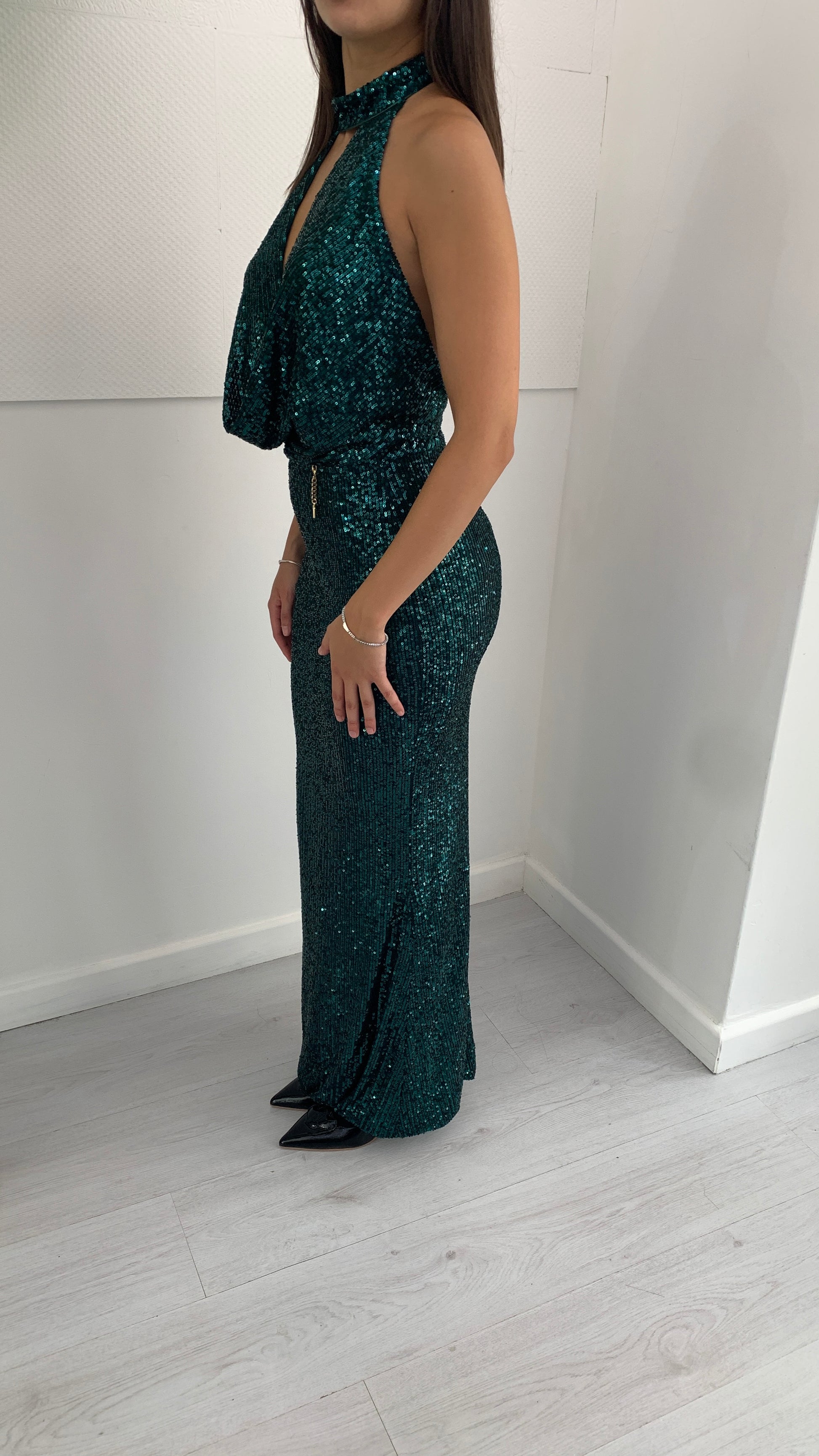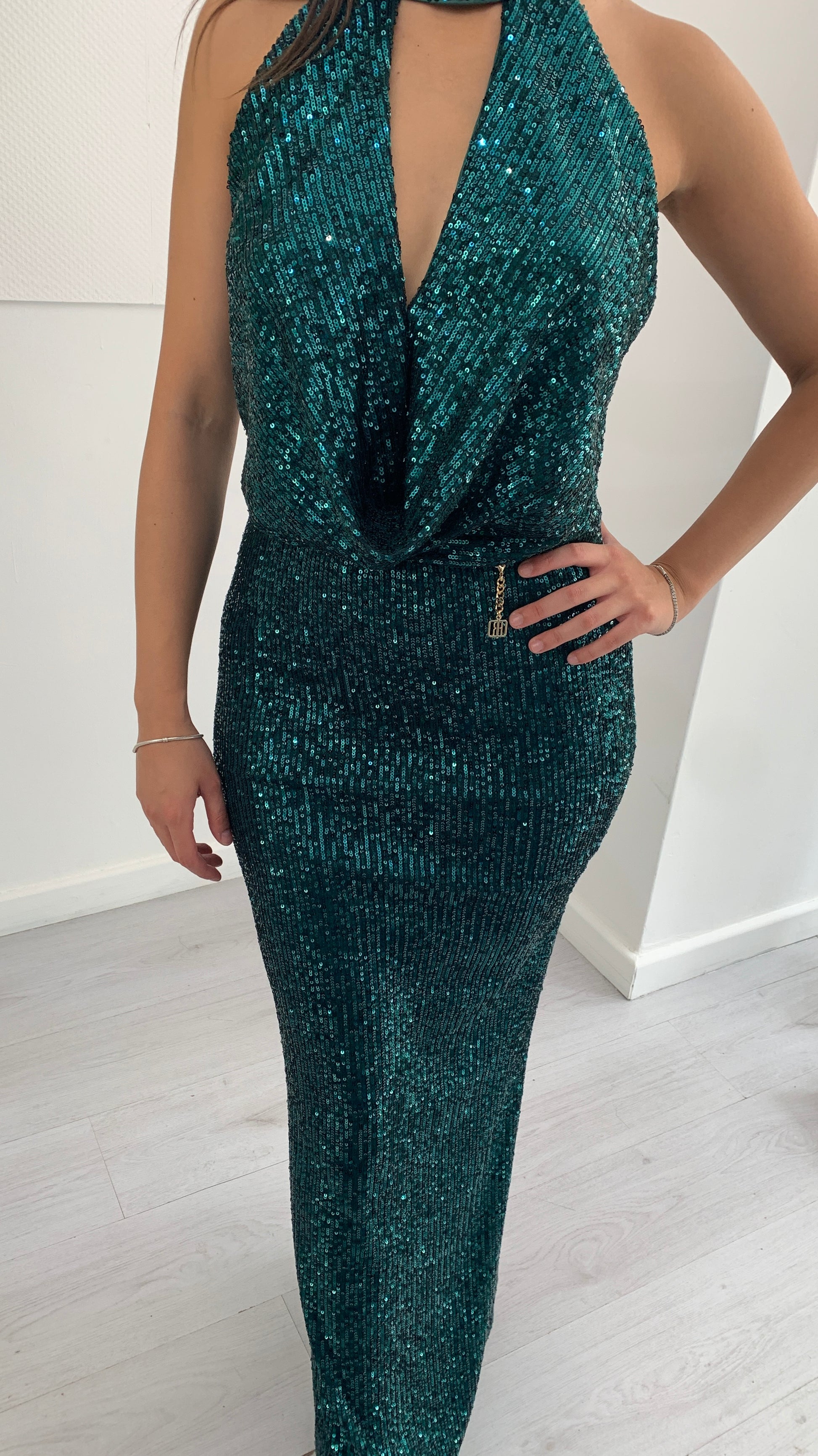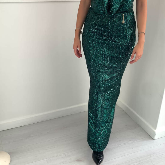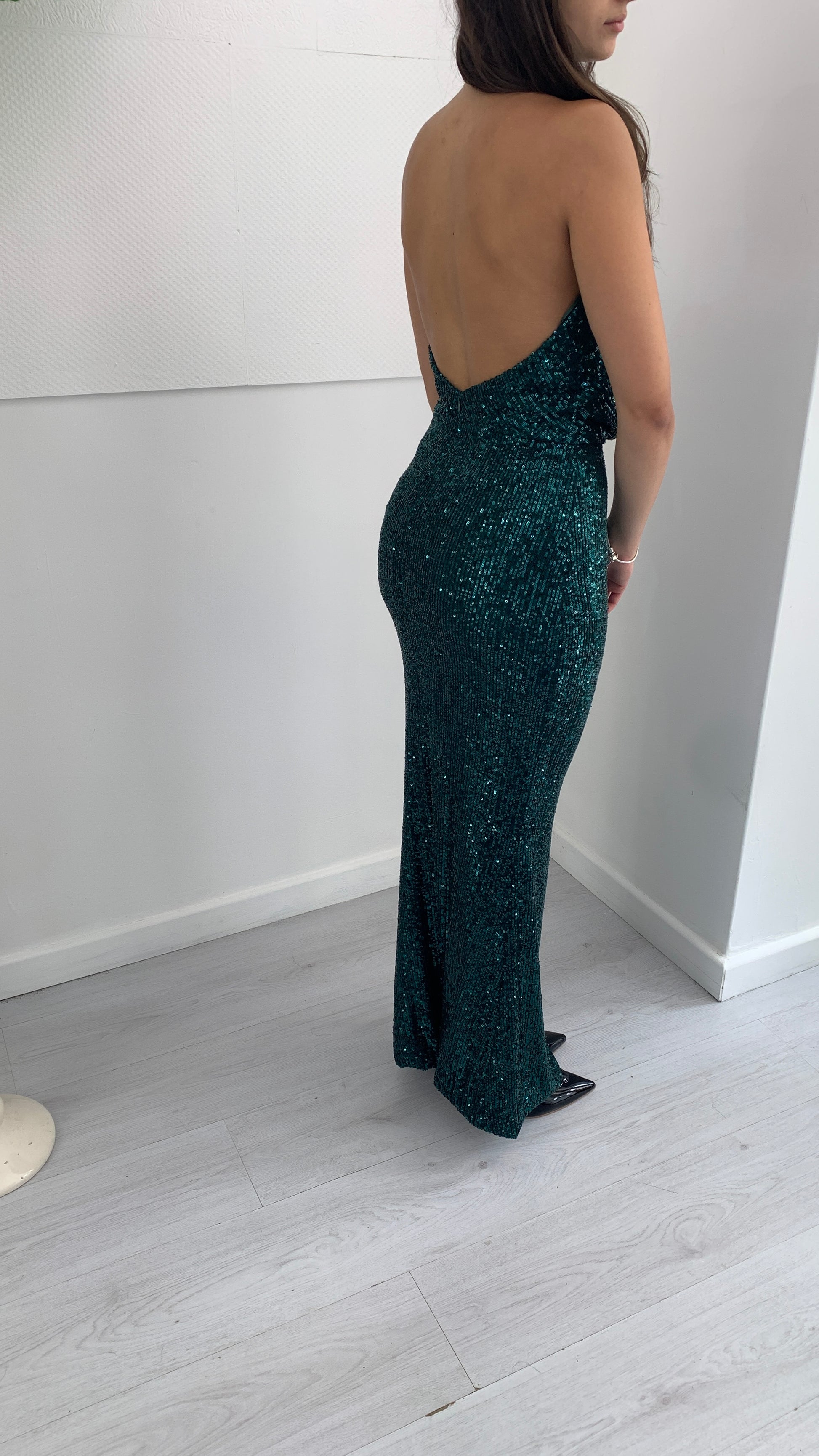 Abito lungo con scollo all’americana impreziosito da eleganti paillettes verde smeraldo, perfetto per serate di classe. Il design raffinato valorizza la silhouette mantenendo un tocco sofisticato e moderno. Ideale per eventi formali e occasioni speciali.