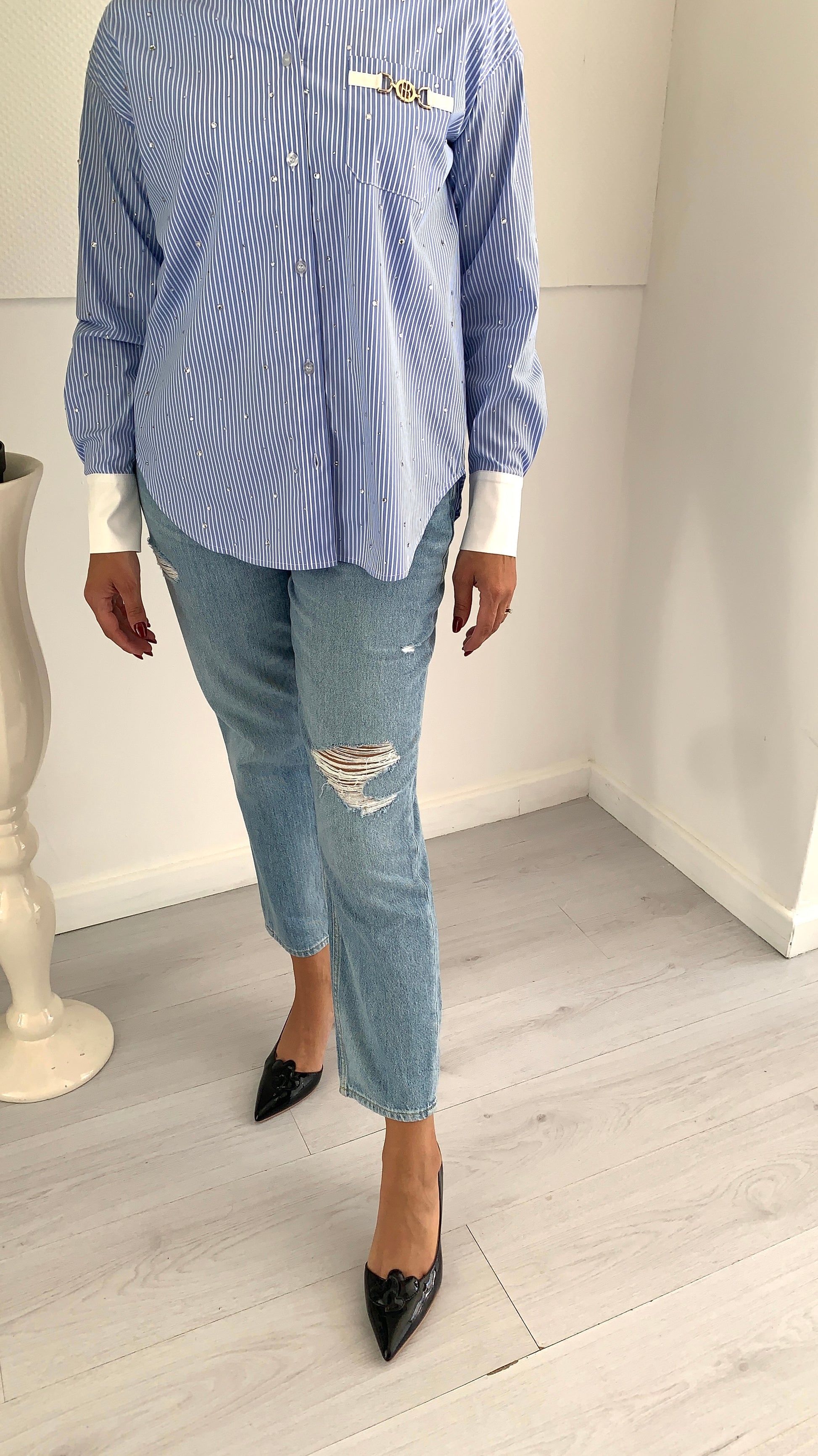 Camicia over rigata FRACOMINA con dettagli di punti luce. Il taglio ampio assicura comfort e stile contemporaneo, perfetta per un look sofisticato ma rilassato.
