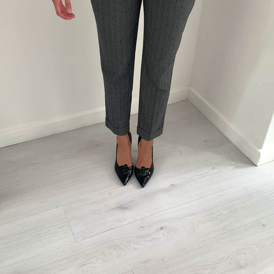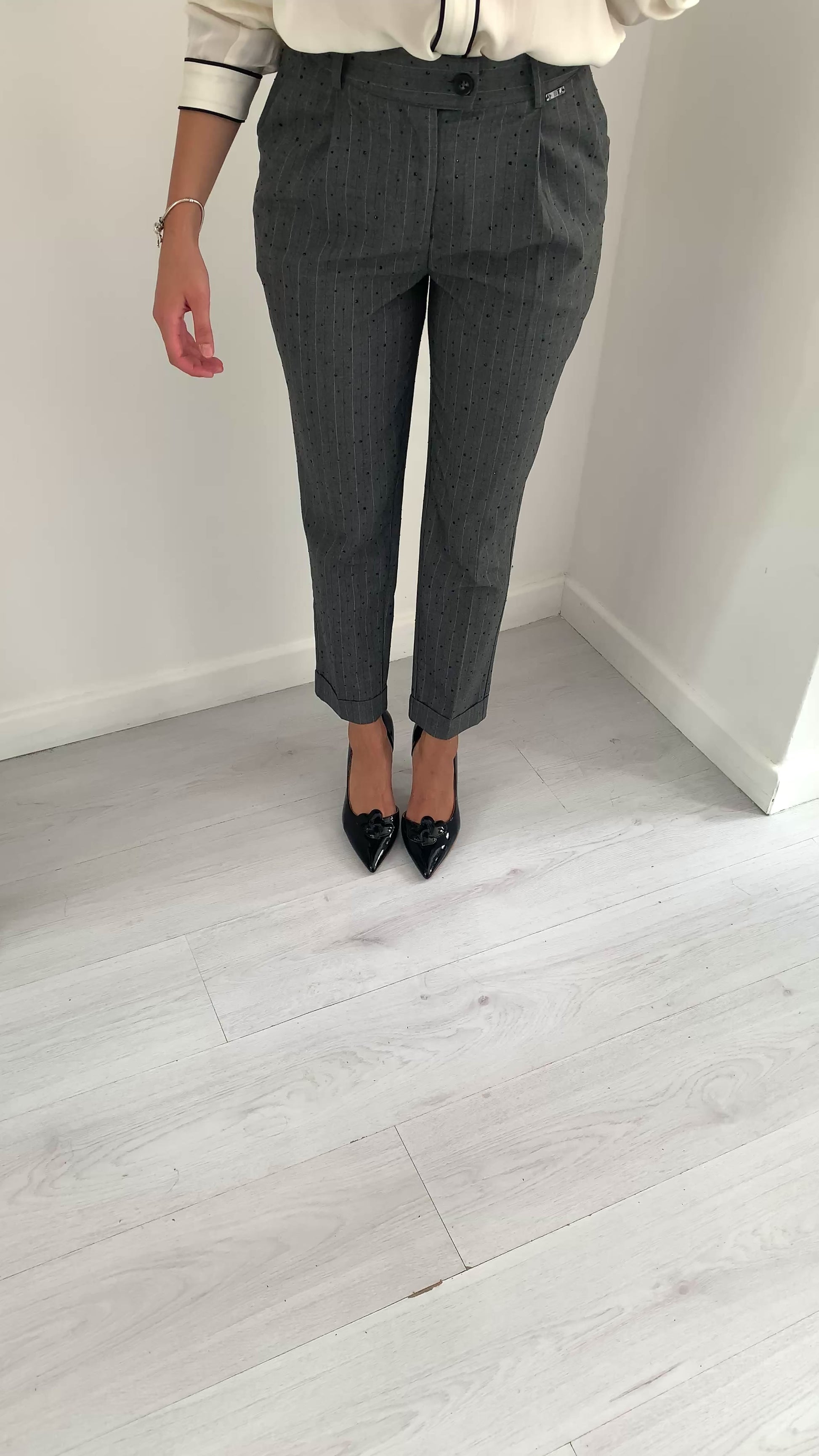 Pantalone modello chinos in tessuto gessato bianco, arricchito da delicati punti luce che donano un tocco raffinato e luminoso. Design elegante e versatile, perfetto per un look contemporaneo e curato in ogni dettaglio.