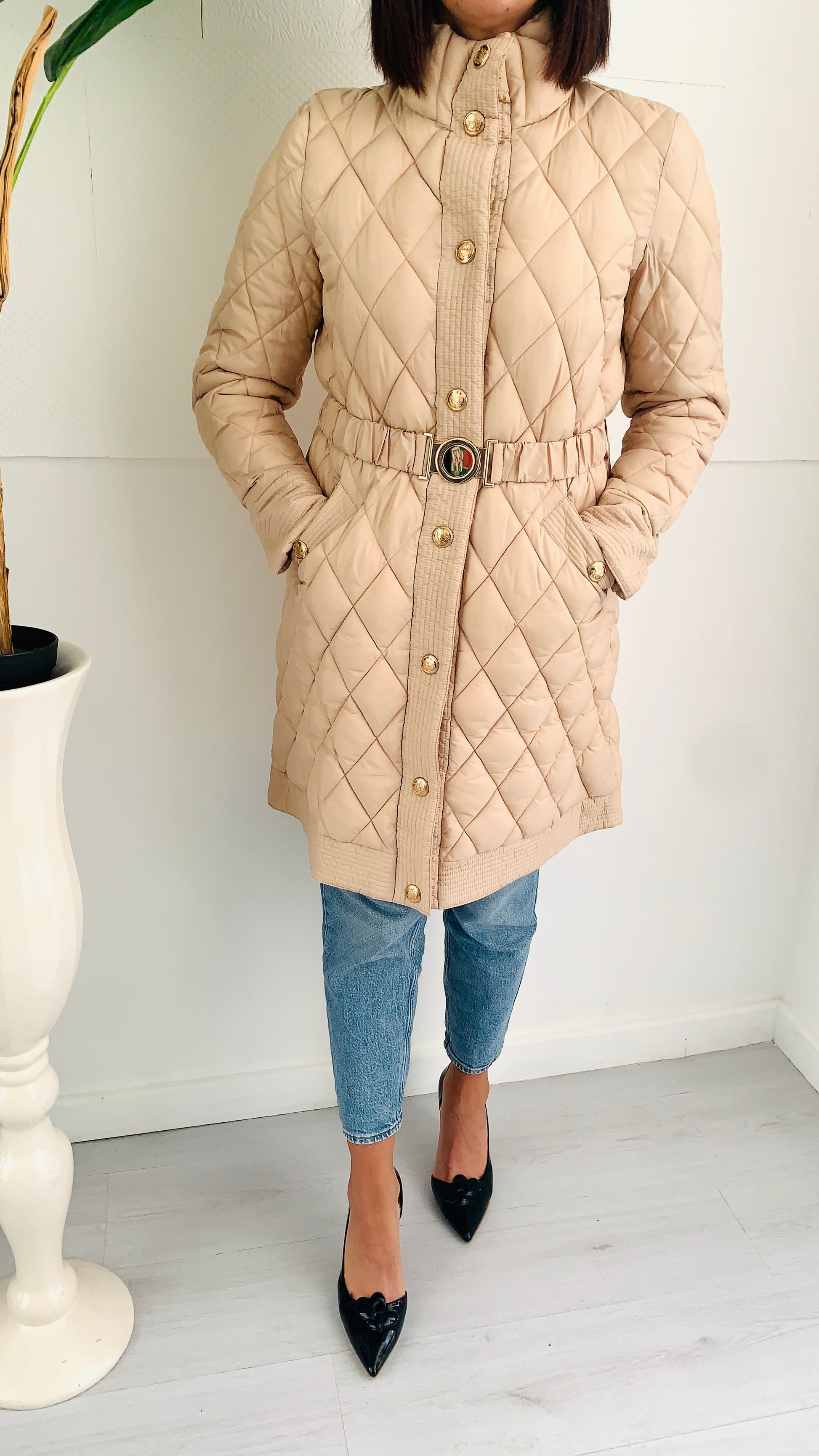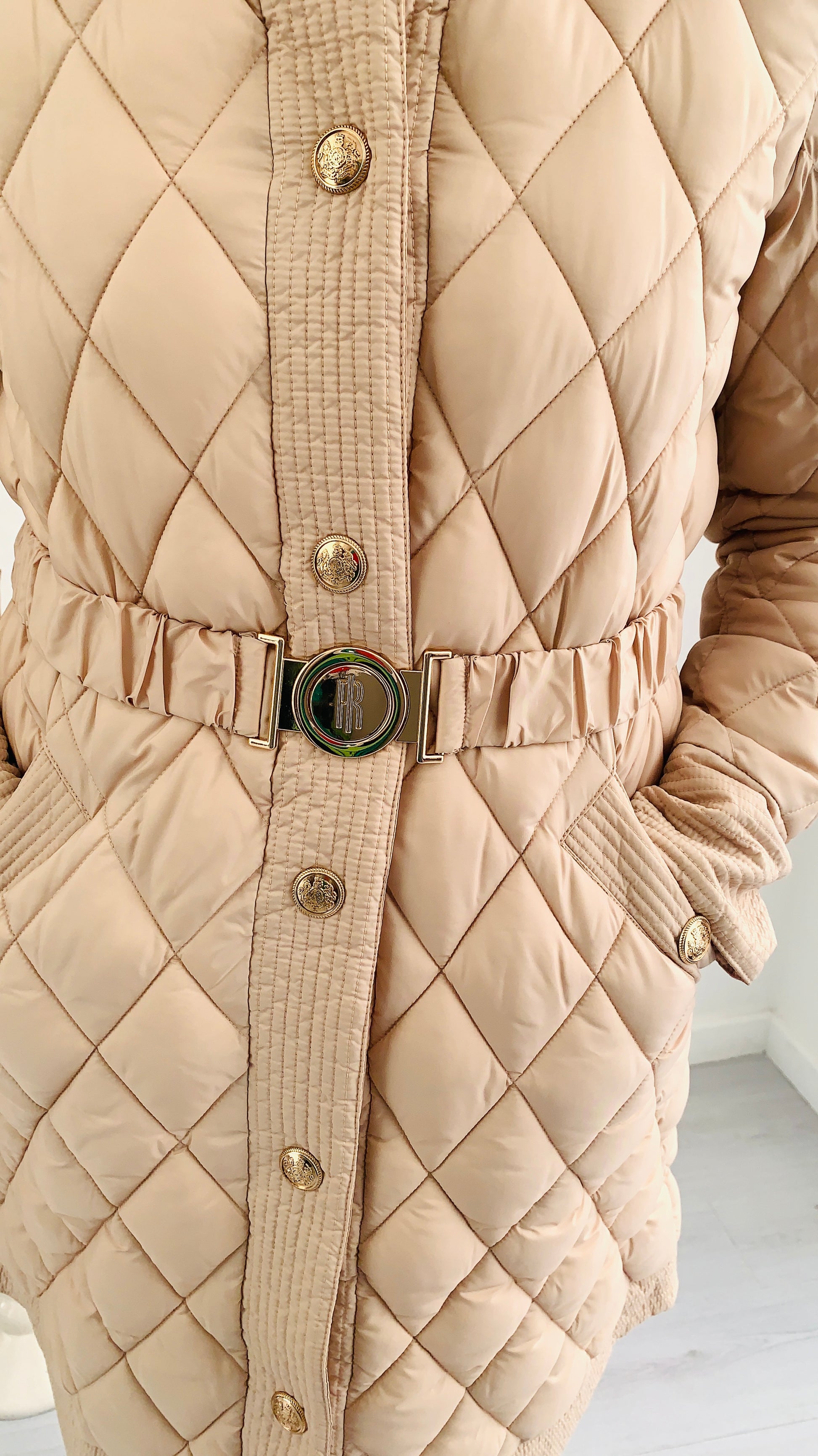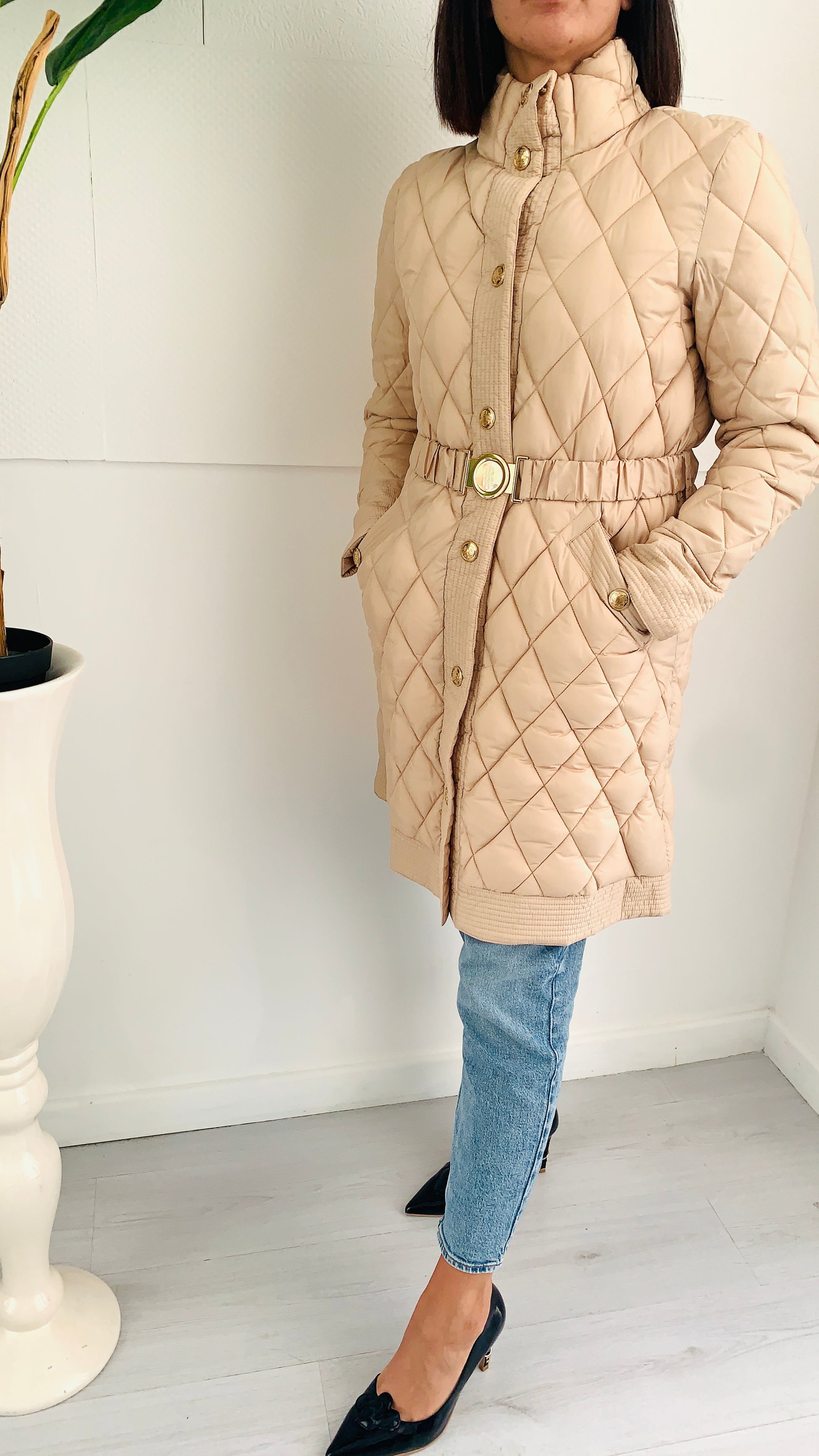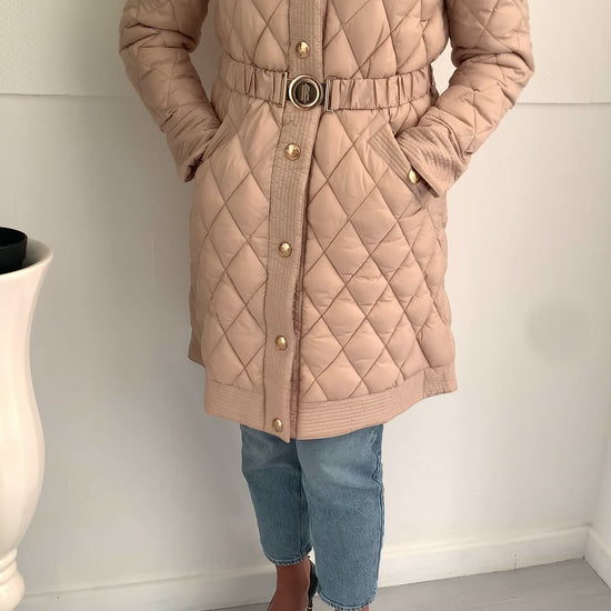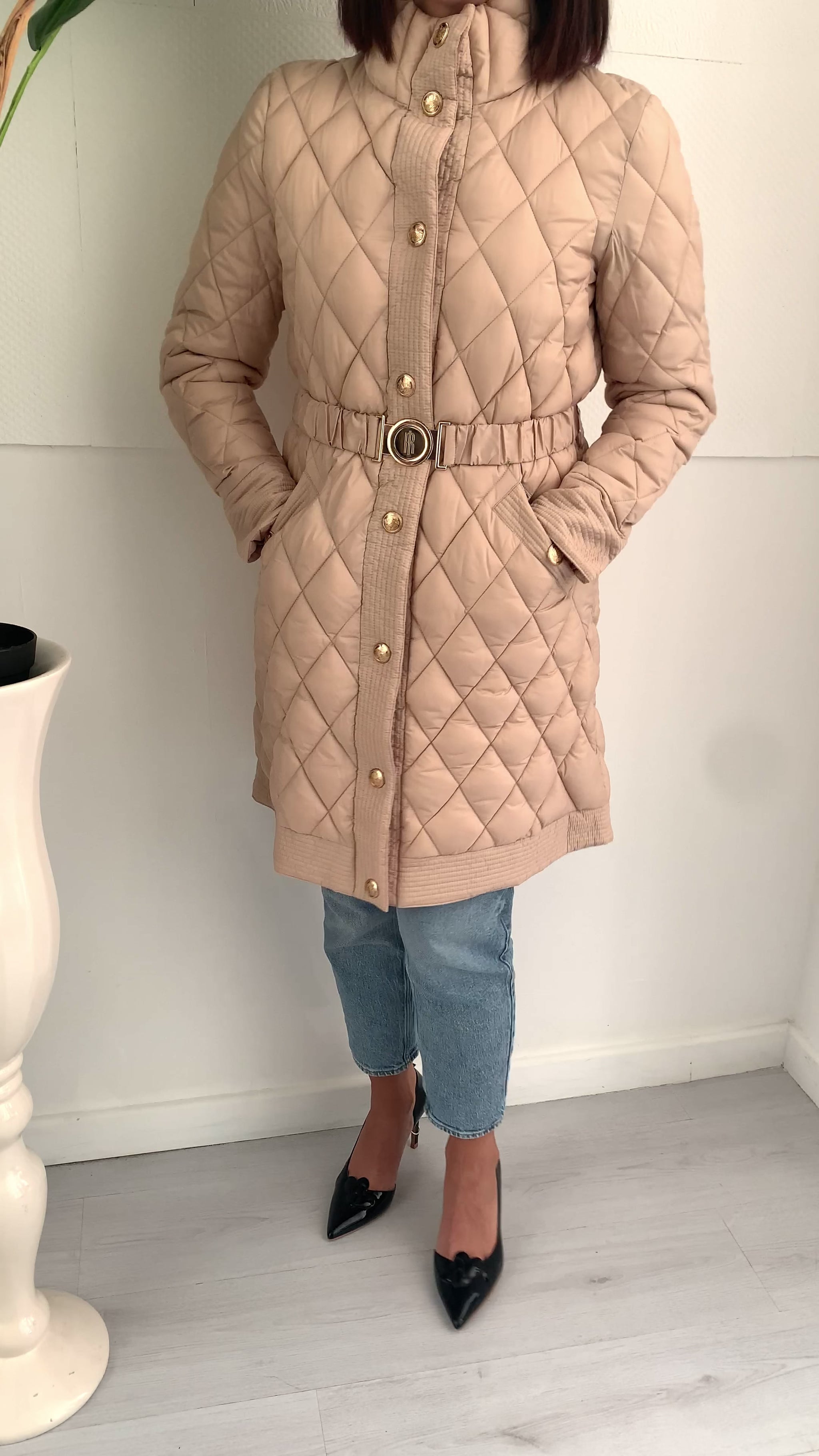 Imbottito 3/4 con cintura, questo piumino FRACOMINA in tonalità biscuit si distingue per l'elegante impuntura a rombo. Perfetto per garantire comfort e stile durante le giornate più fresche.