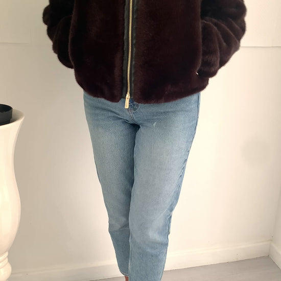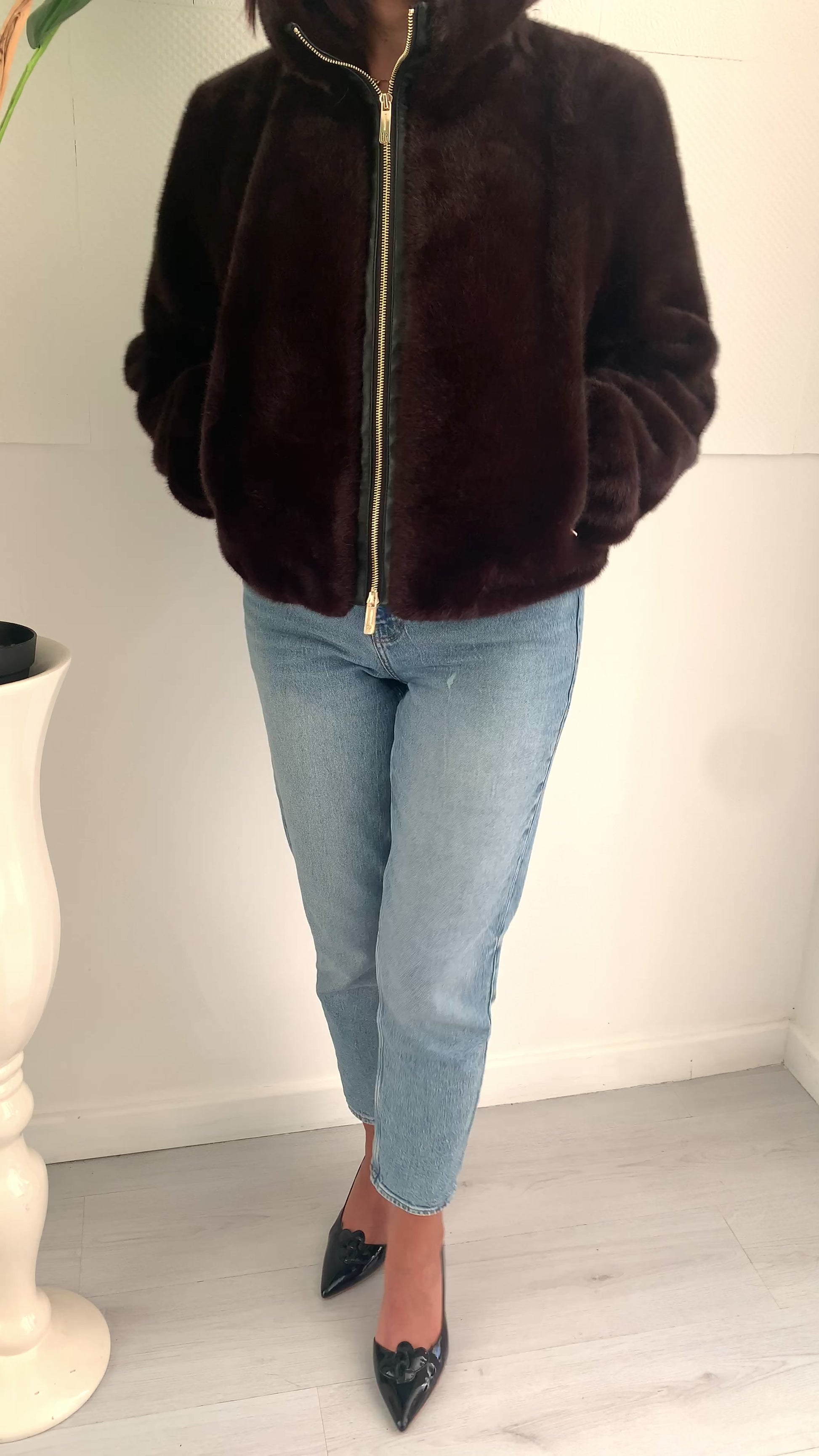 Pelliccia effetto visone FRACOMINA con raffinati inserti in pelle e cerniera color oro, un equilibrio perfetto tra eleganza e funzionalità per un look sofisticato e moderno.