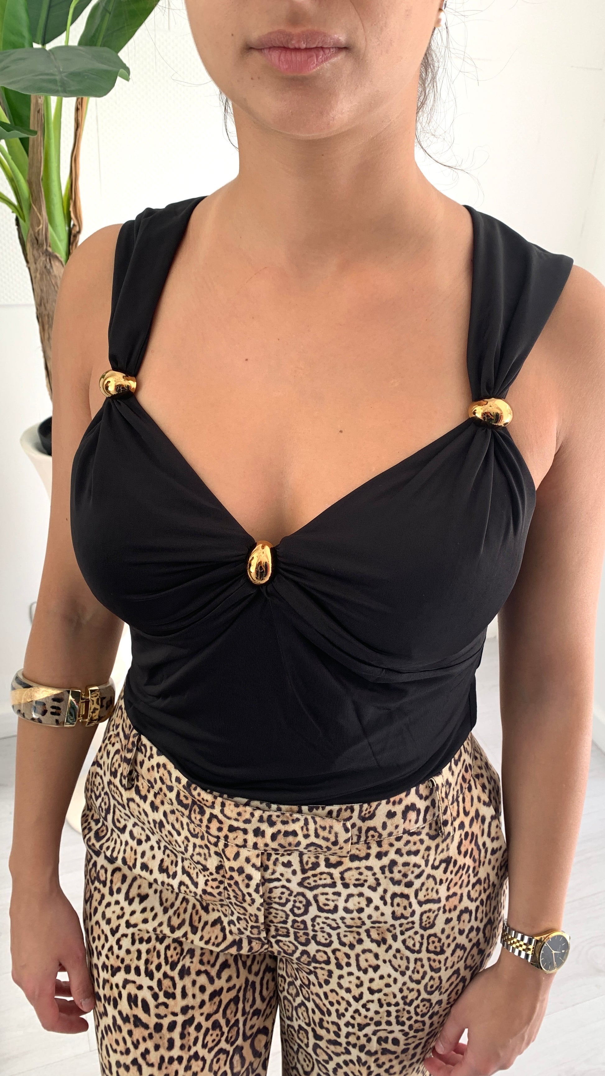 Questo top in jersey si distingue per il raffinato scollo a cuore impreziosito da nodi oro, che donano un tocco di eleganza sofisticata. Realizzato in un tessuto morbido e aderente, valorizza la silhouette garantendo comfort e stile. Ideale per occasioni speciali o per un look elegante ma moderno, è un capo versatile che unisce design e qualità.