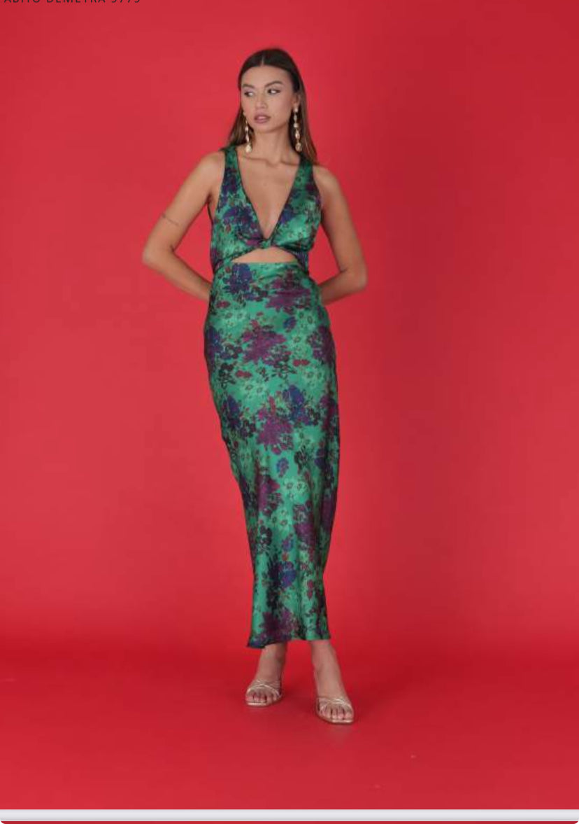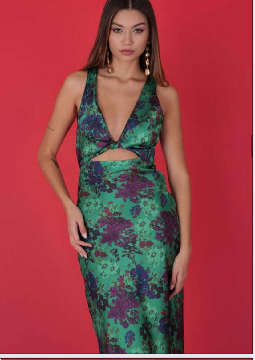 Vesti il tuo fascino con l'abito Queguapa Fantasy Demetra in morbida seta! Lunghezza midi, scollo a V ed elegante apertura sulla pancia, per un look delicato e sensualmente seducente. Aggiungi un tocco di glamour al tuo guardaroba!