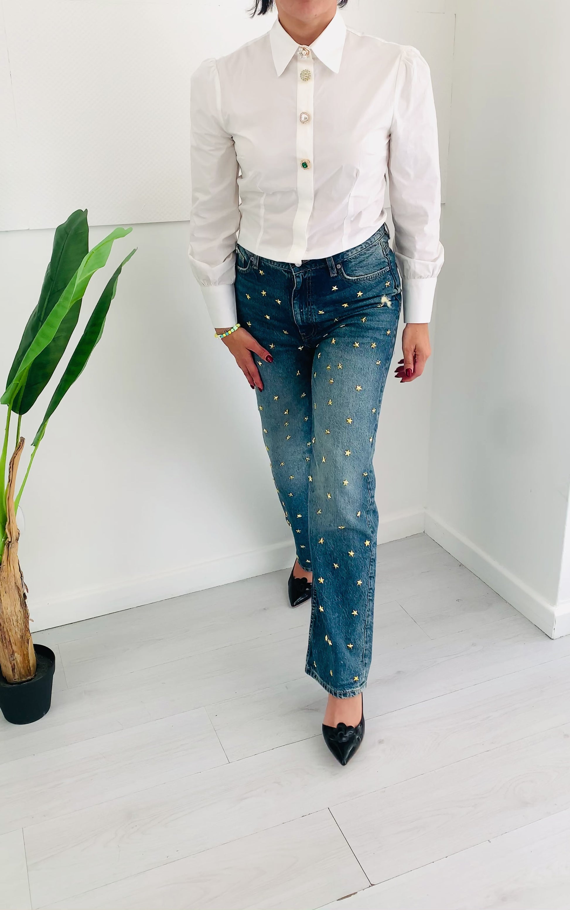 Questa camicia in puro cotone unisce eleganza e praticità grazie ai bottoni gioiello rimovibili con clip, per adattarsi a ogni occasione con stile e semplicità. Il tessuto traspirante garantisce comfort tutto il giorno, mentre il design raffinato valorizza ogni tuo look con un tocco di lusso discreto.
