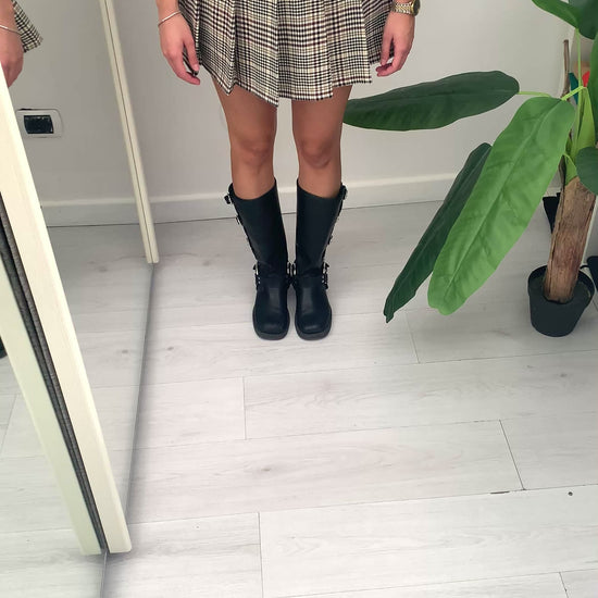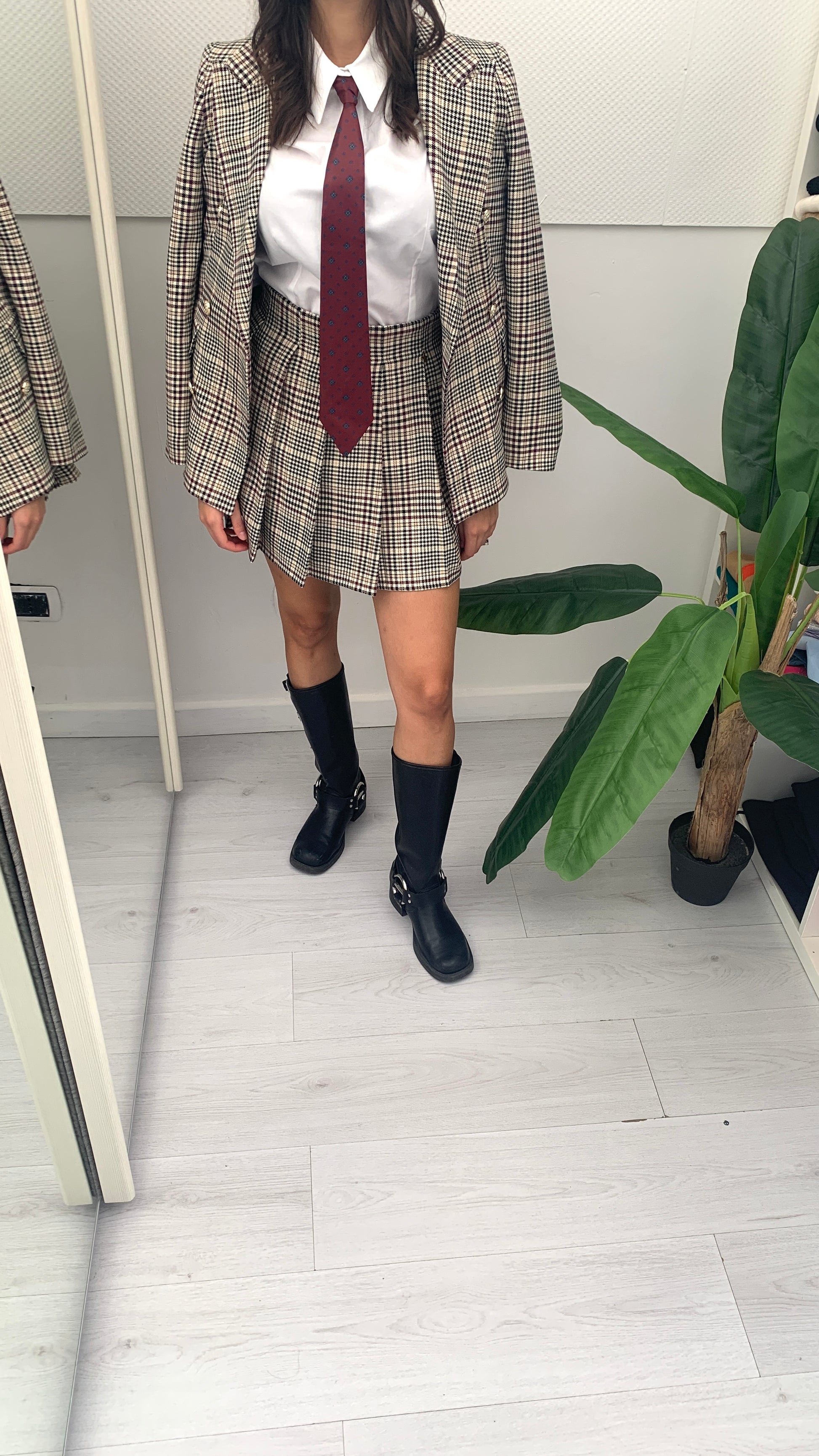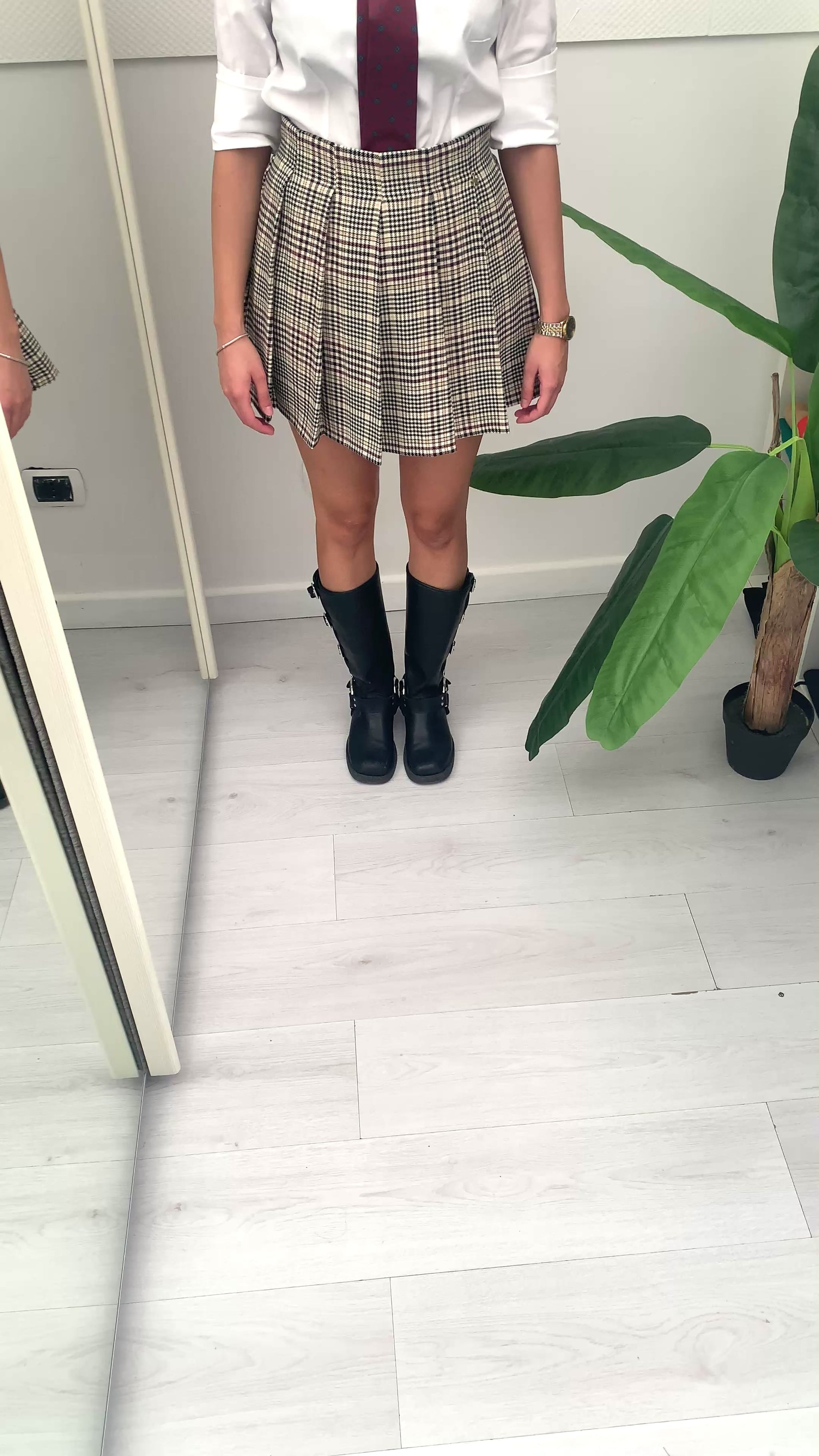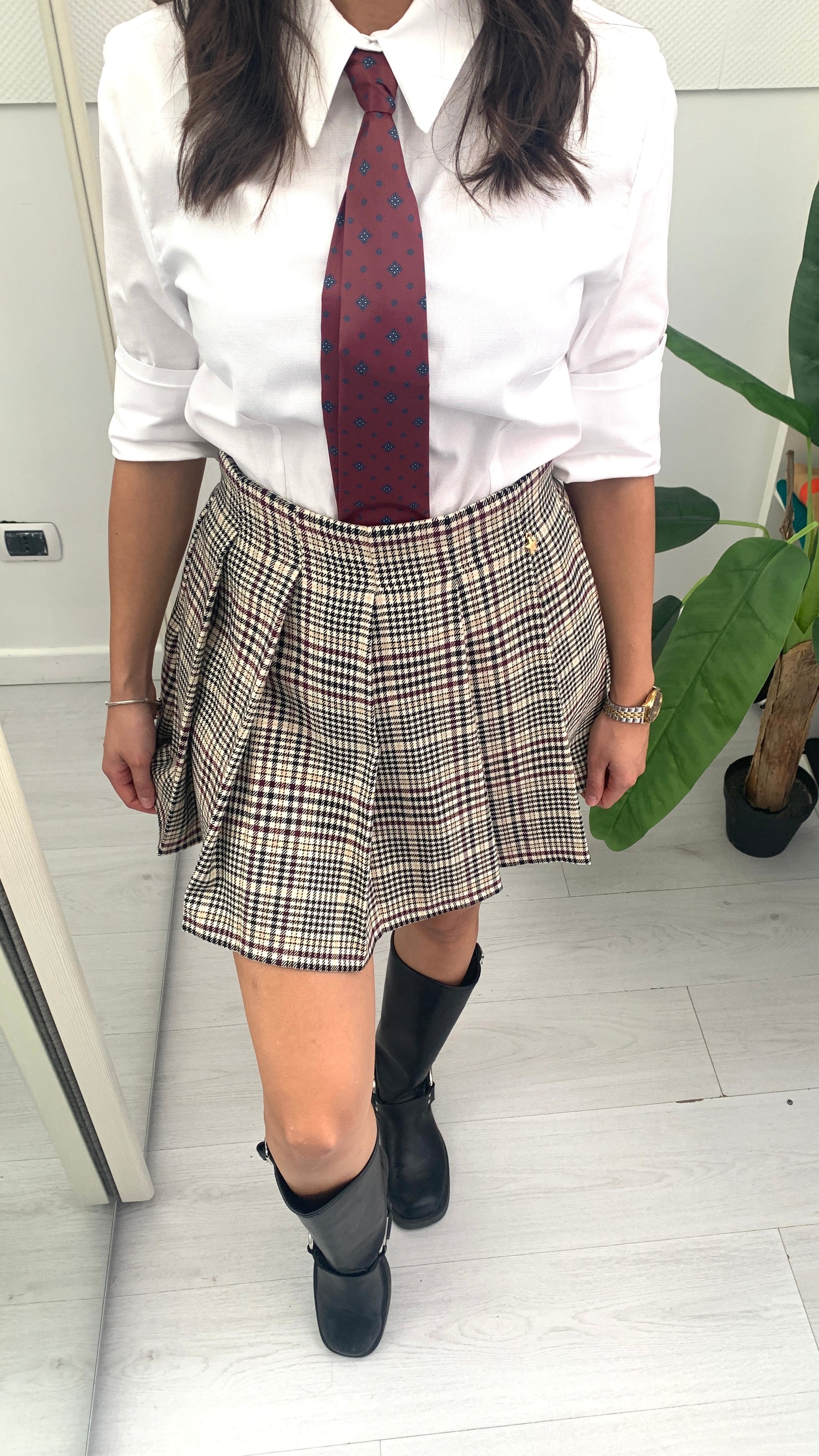 Questa gonna corta con pieghe presenta un raffinato motivo a quadri bordeaux, ideale per un look elegante e moderno. Il taglio sagomato valorizza la silhouette, mentre il tessuto di qualità assicura comfort e durata. Perfetta per abbinamenti sia casual che più formali.