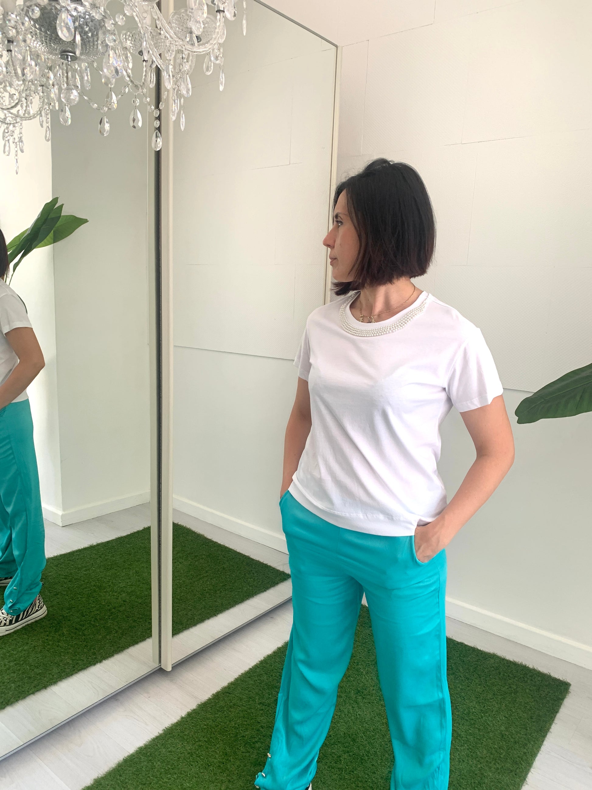 Questa T-shirt QUEGUAPA con manica corta si distingue per il dettaglio raffinato delle perle applicate sul girocollo, che aggiungono un tocco di eleganza a un capo casual. Realizzata con materiali di qualità, garantisce comfort e vestibilità ottimale, rendendola ideale per chi cerca uno stile sofisticato senza rinunciare alla praticità quotidiana. Perfetta da abbinare sia a look informali che a outfit più curati.