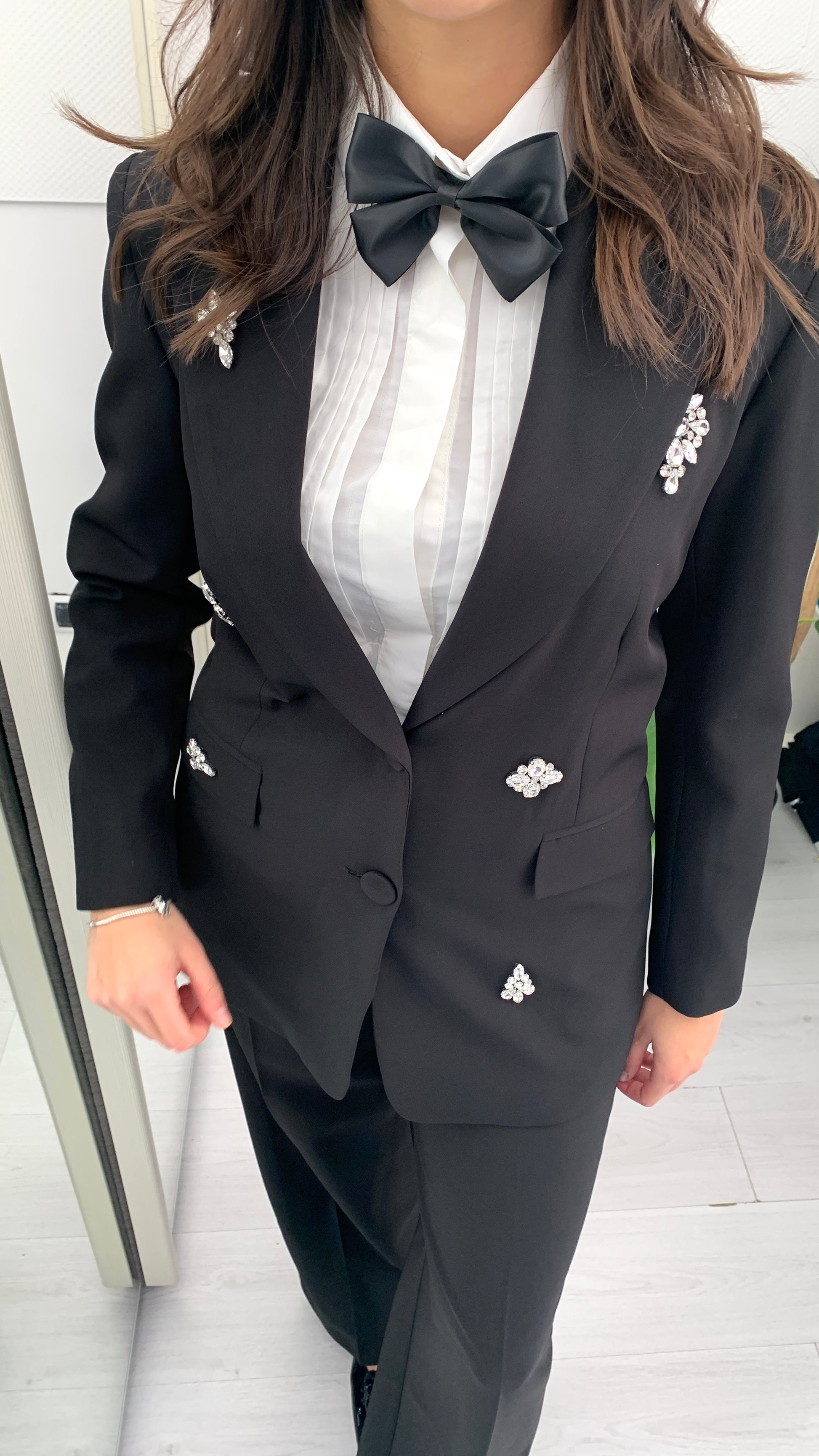 Questo tailleur Enea QUEGUAPA combina eleganza e funzionalità, con una giacca dritta arricchita da sofisticate applicazioni e un pantalone dritto dotato di tasche capienti, ideale per un look professionale senza rinunciare al comfort.