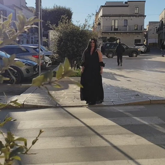 Esalta la tua eleganza con l'abito cerimonia Sophie. Il nero morbido incontra lo scollo a V e il punto vita gioiello per un look ancora più raffinato. Aggiungi un tocco di gioiello al tuo stile e lasciati conquistare dall'eleganza di Sophie. Lo stile perfetto per ogni occasione speciale!